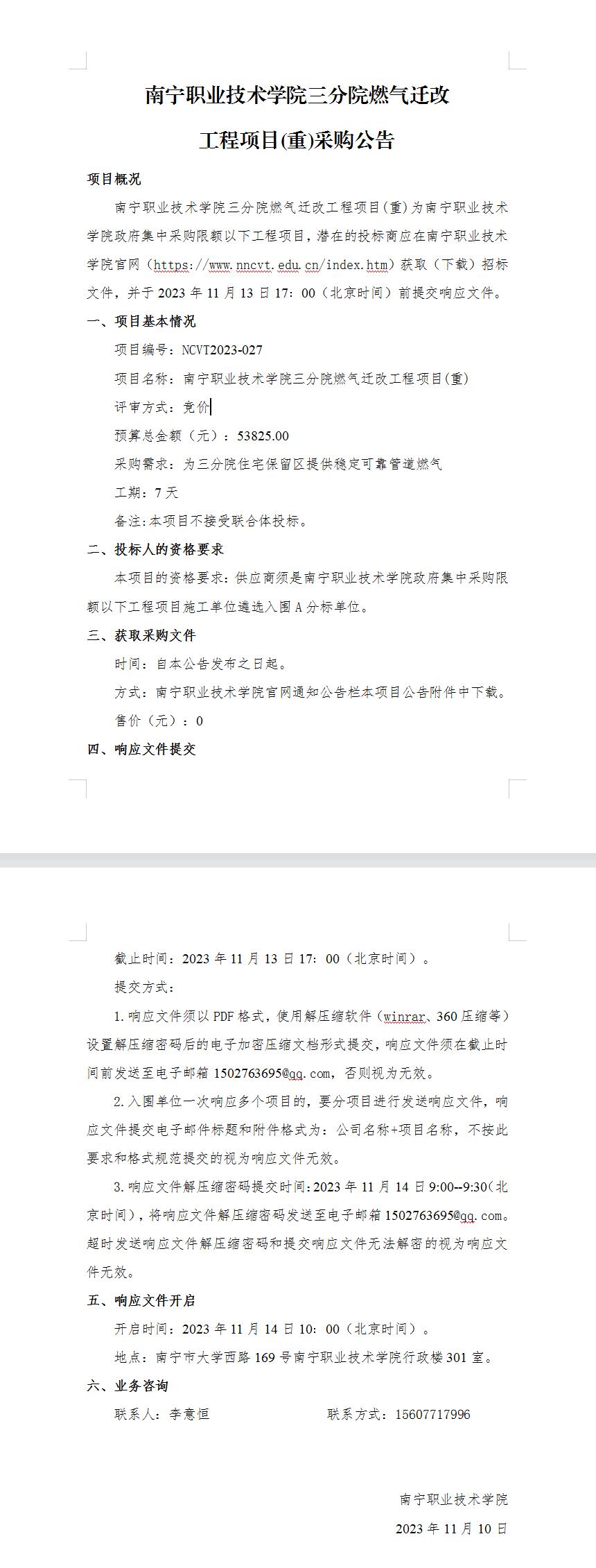 南宁职业技术学院三分院燃气迁改工程项目(重)采购公告