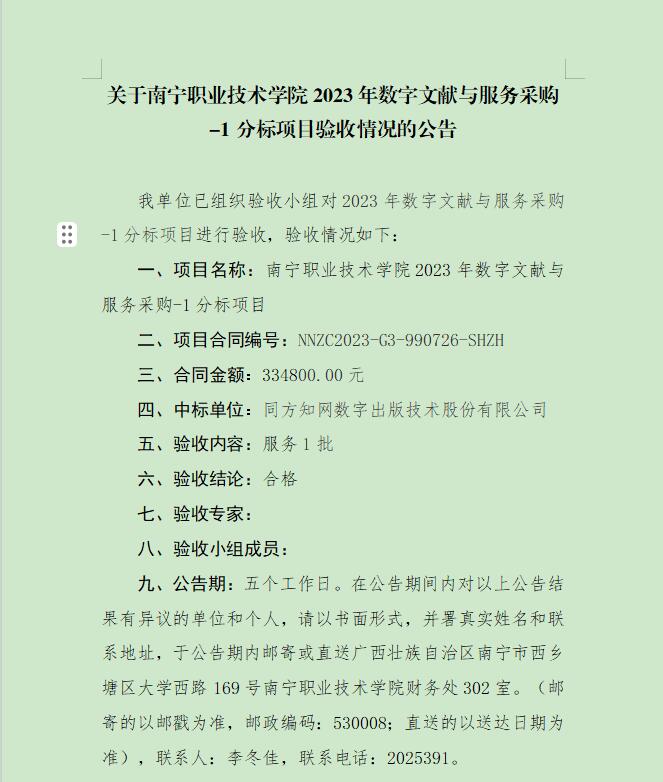 关于南宁职业技术学院2023年数字文献与服务采购-1分标项目验收情况的公告