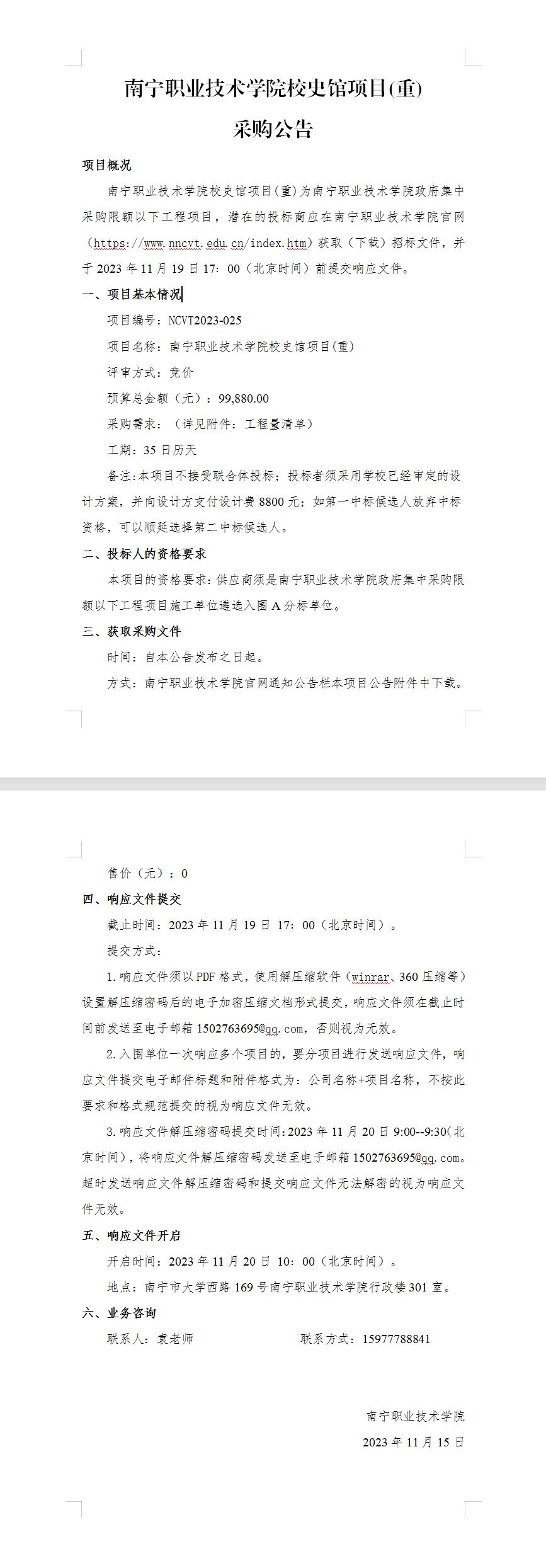 南宁职业技术学院校史馆项目(重)-采购公告