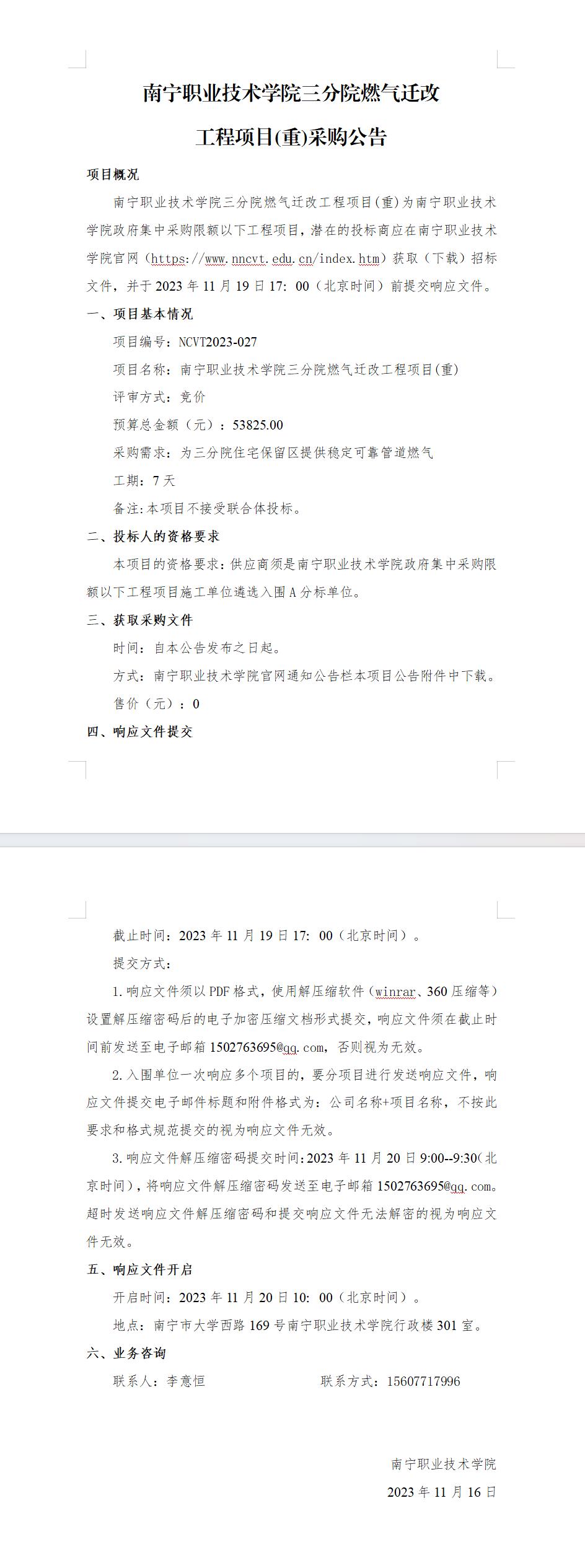 南宁职业技术学院三分院燃气迁改工程项目(重)采购公告