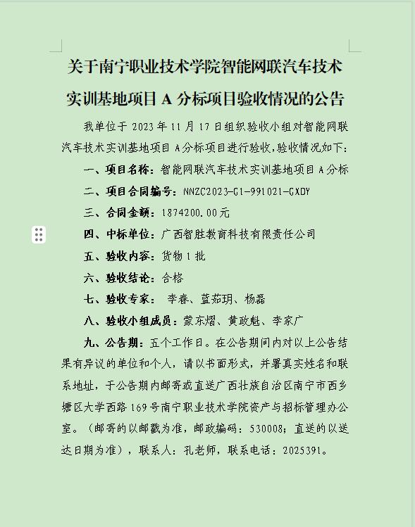 关于南宁职业技术学院智能网联汽车技术实训基地项目A分标项目验收情况的公告