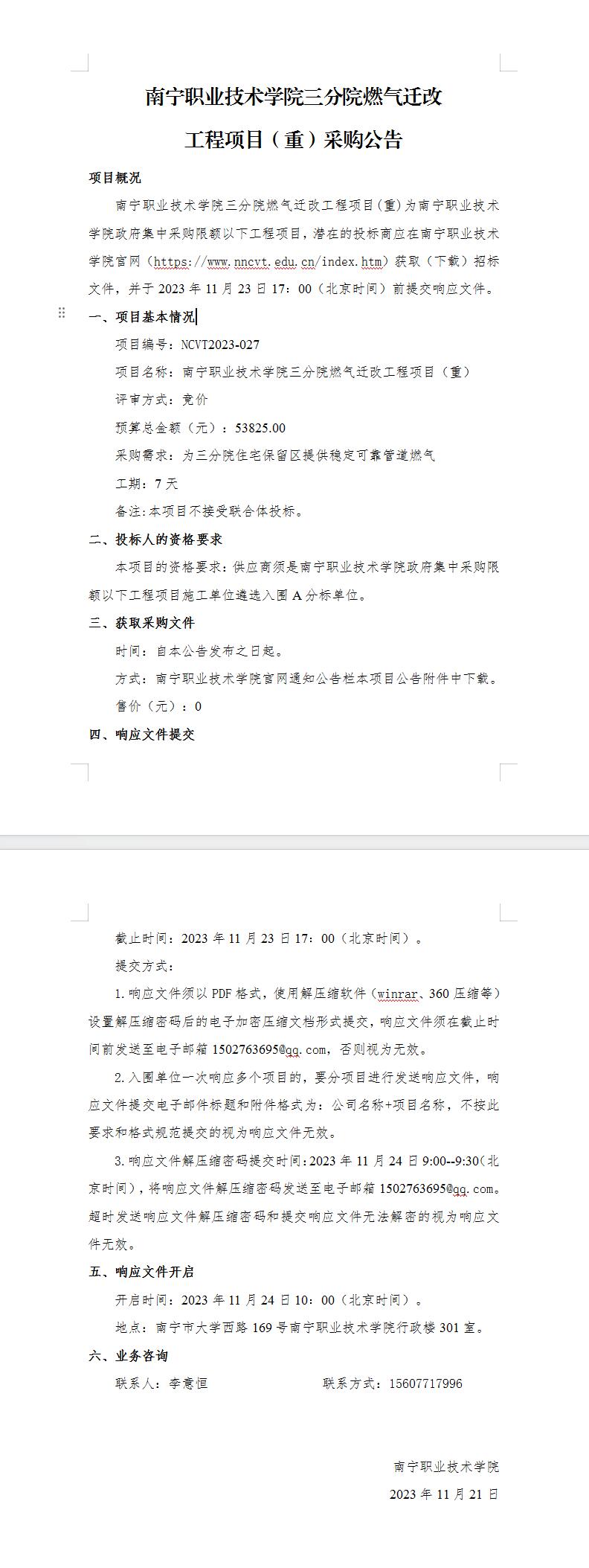 南宁职业技术学院三分院燃气迁改工程项目(重)-采购公告