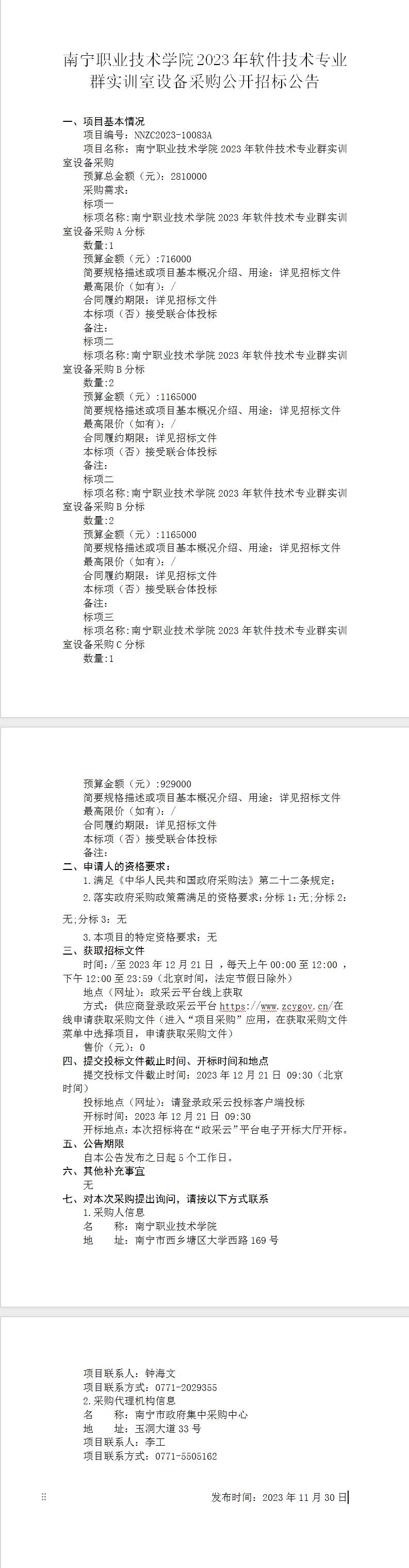 南宁职业技术学院2023年软件技术专业群实训室设备采购-公开招标公告