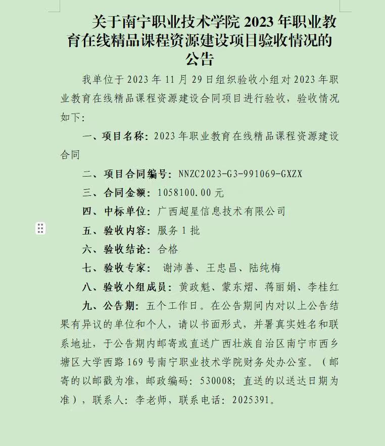 南宁职业技术学院2023年职业教育在线精品课程资源建设项目验收公告
