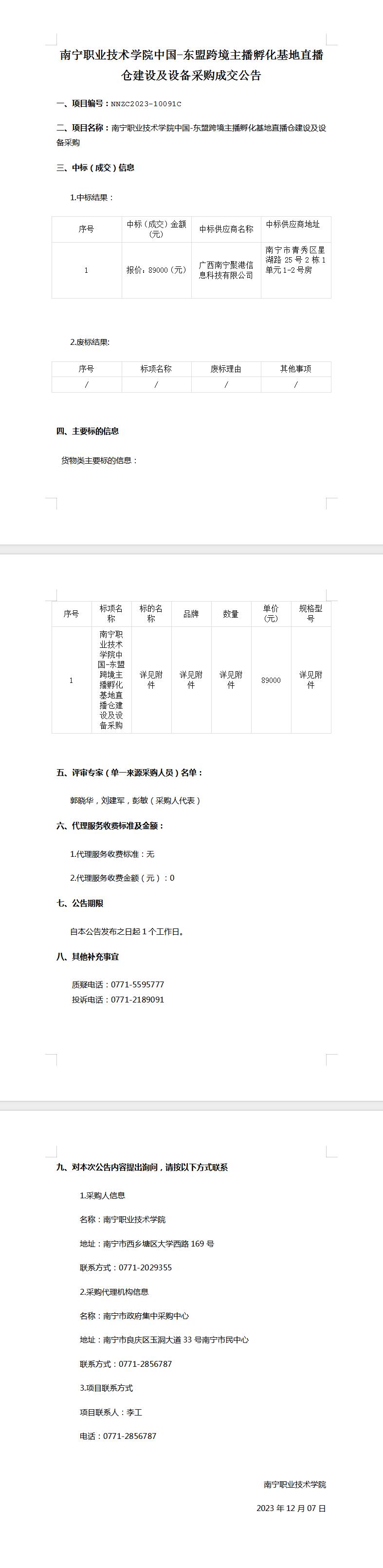 南宁职业技术学院中国-东盟跨境主播孵化基地直播仓建设及设备采购-中标结果公告