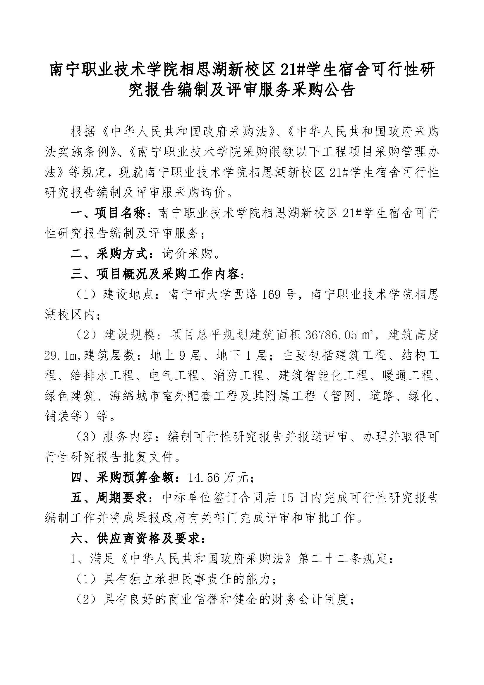 南宁职业技术学院相思湖新校区21#学生宿舍可行性研究报告编制及评审服务采购公告