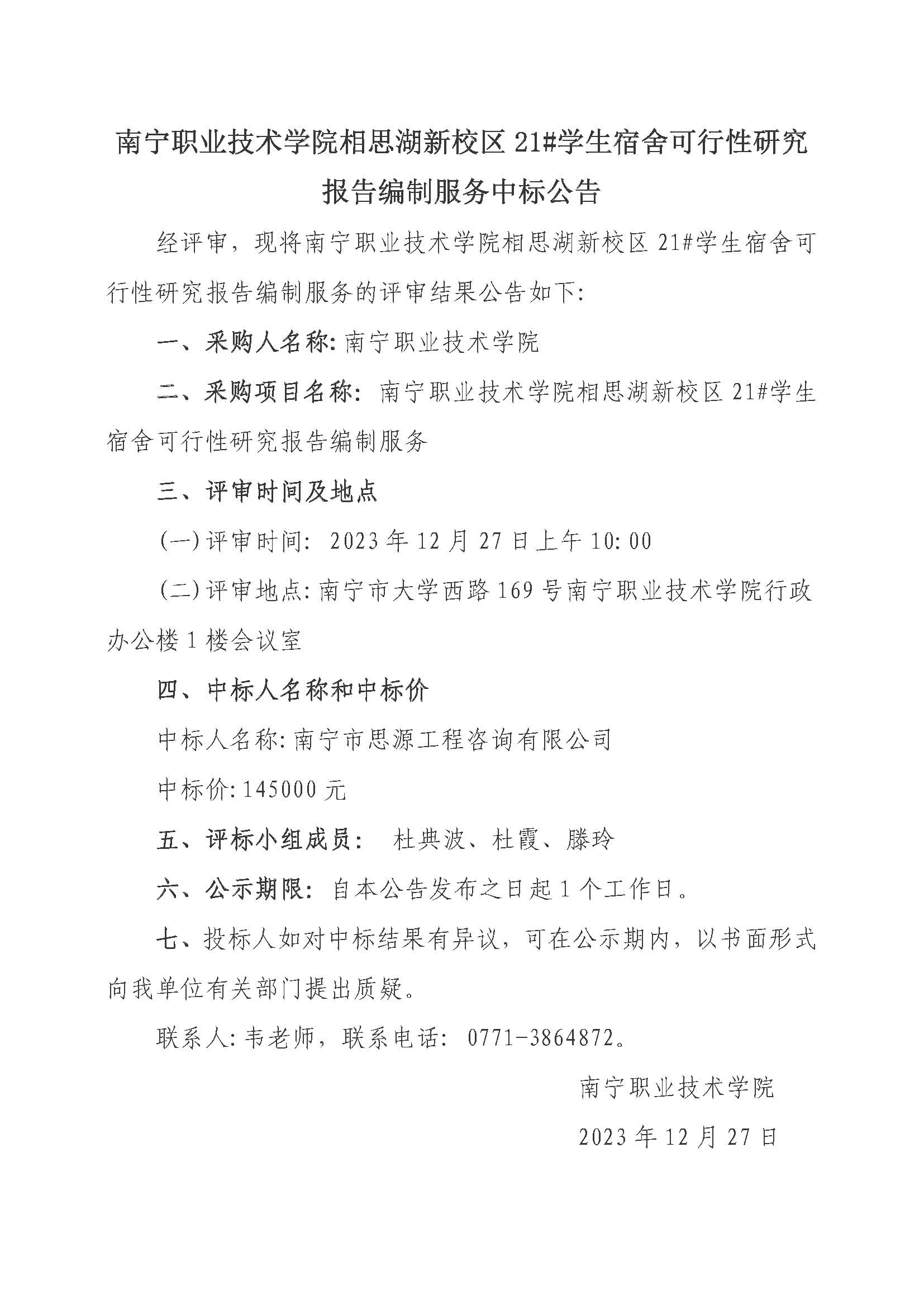 南宁职业技术学院相思湖新校区21#学生宿舍可行性研究报告编制服务中标公告