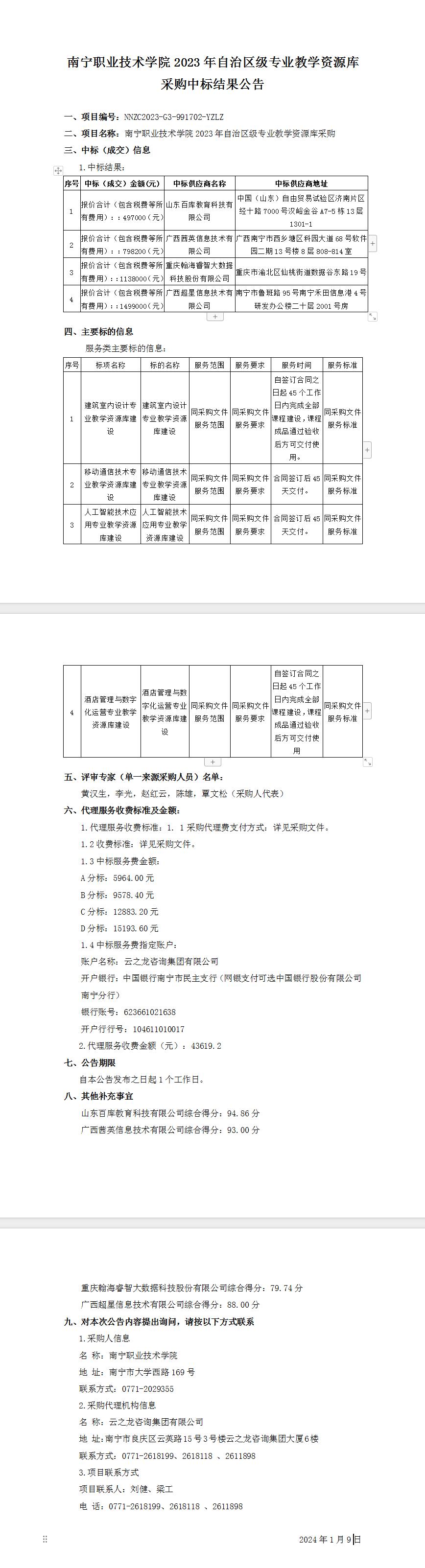 南宁职业技术学院2023年自治区级专业教学资源库采购-中标结果公告