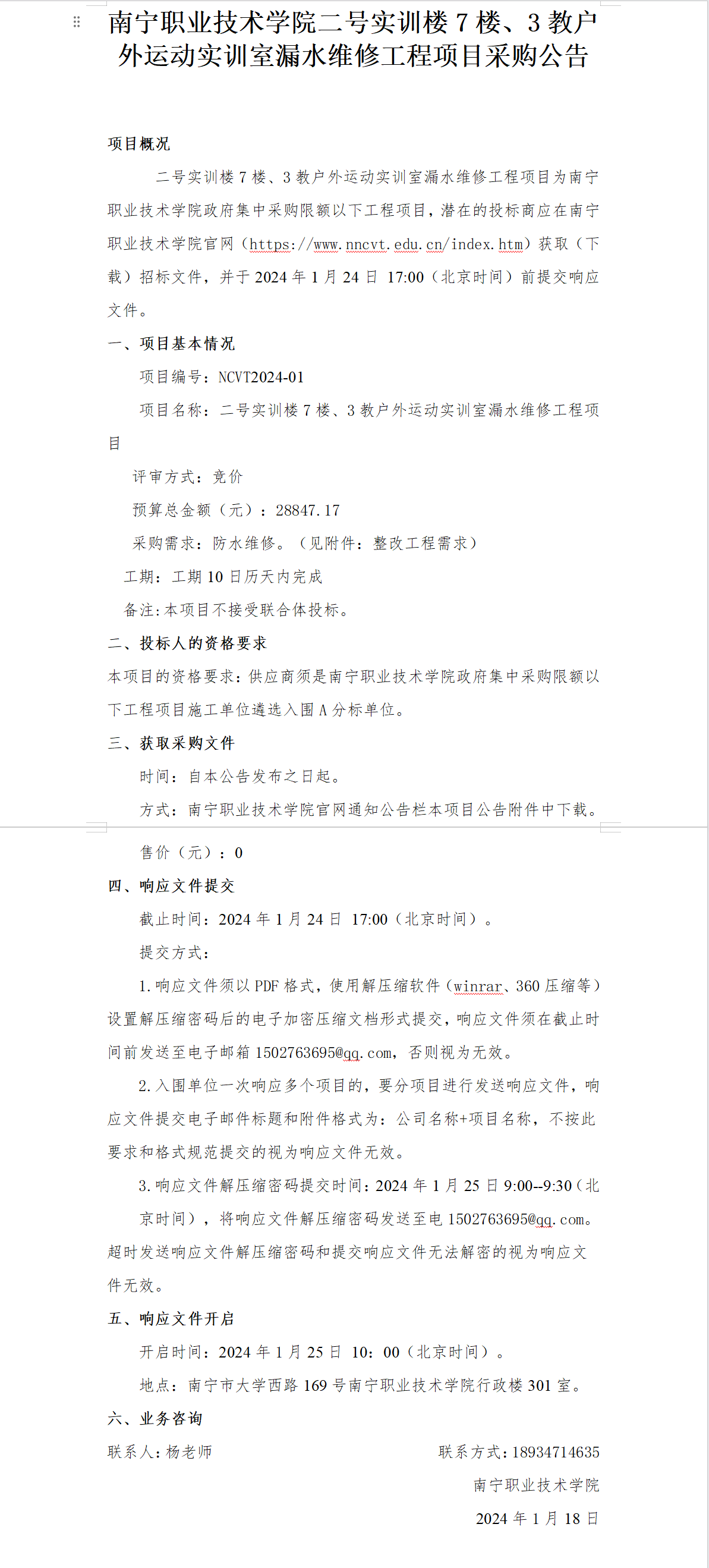 南宁职业技术学院二号实训楼7楼、3教户外运动实训室漏水维修工程项目采购公告