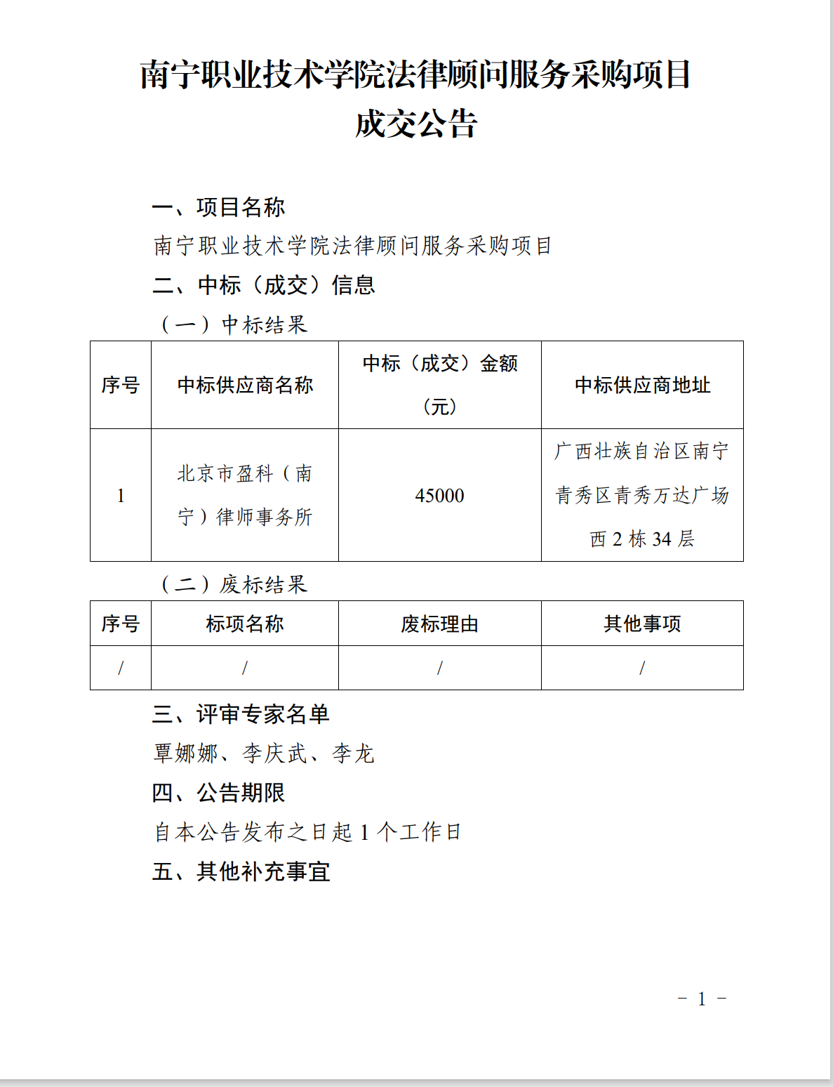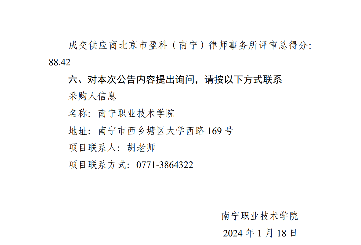南宁职业技术学院法律顾问服务采购项目成交公告