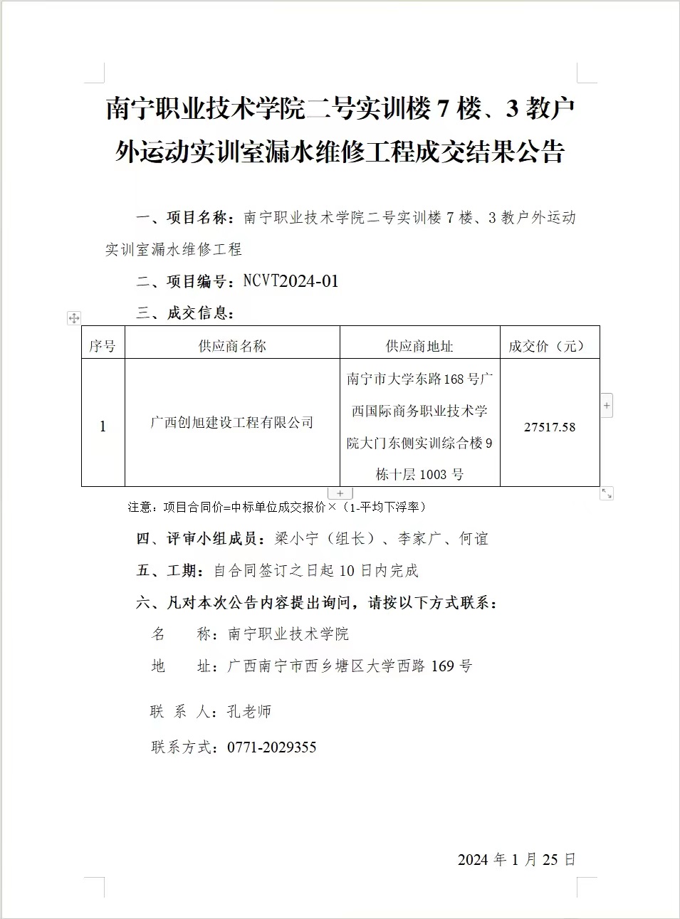 南宁职业技术学院二号实训楼 7 楼、3 教户外运动实训室漏水维修工程成交结果公告