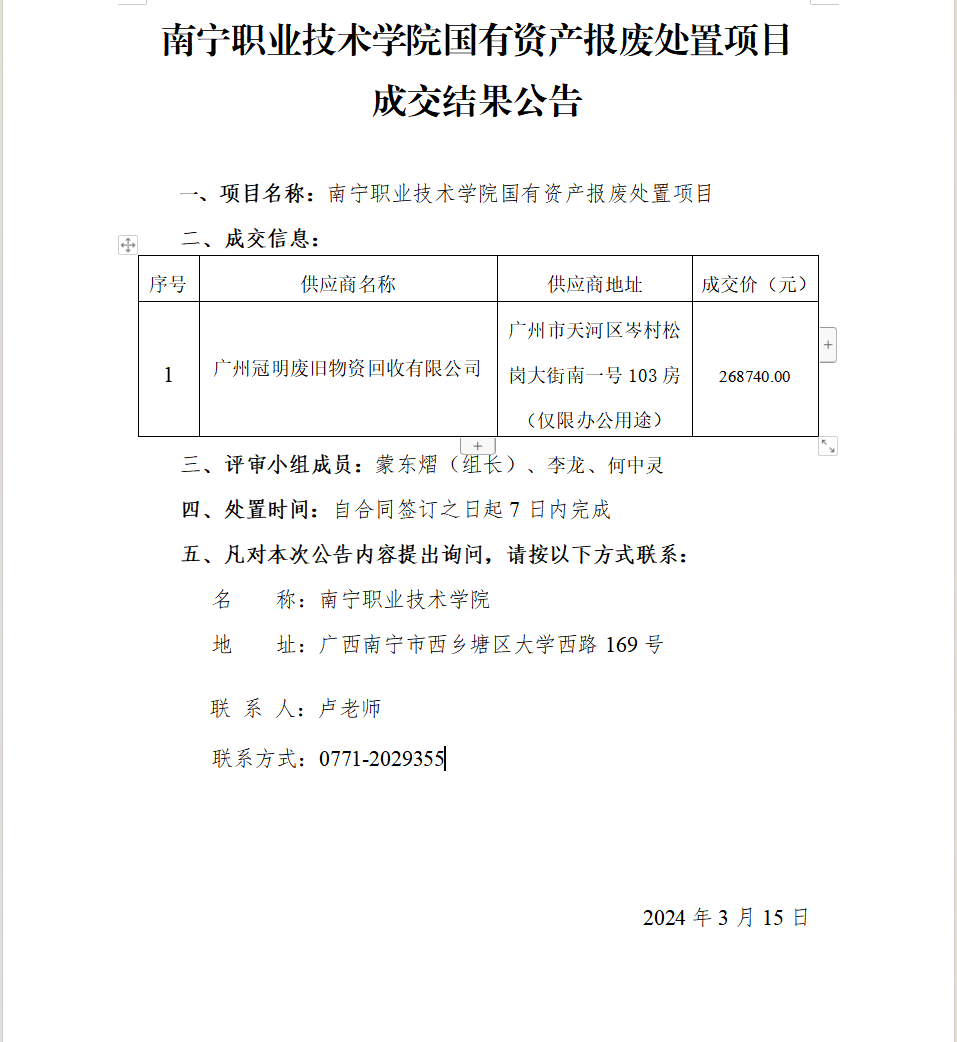 南宁职业技术学院国有资产报废处置项目-成交结果公告