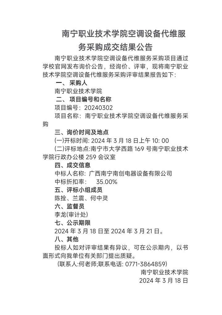 南宁职业技术学院空调设备代维服务采购-成交结果公告