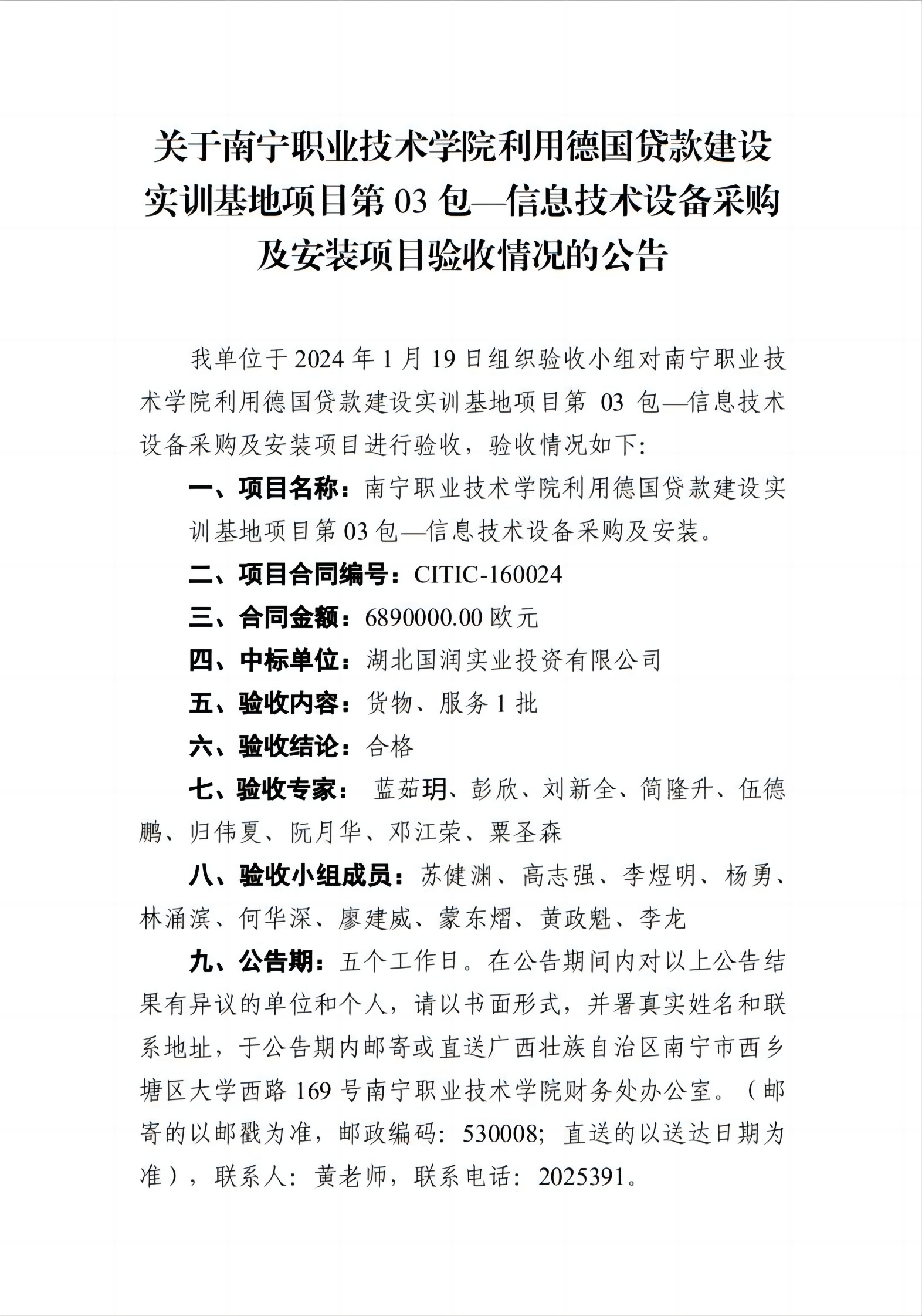 关于南宁职业技术学院利用德国贷款建设实训基地项目第03包—信息技术设备采购及安装项目验收情况的公告