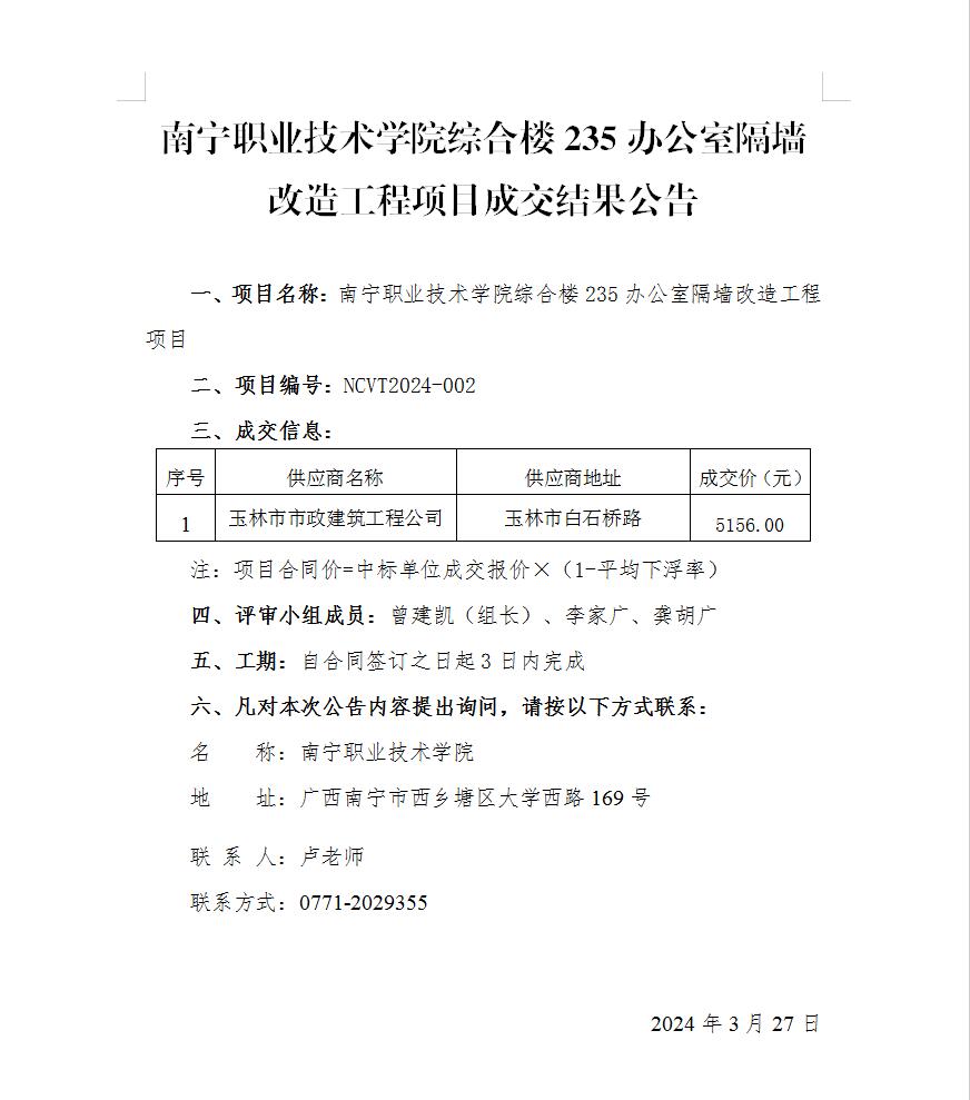 南宁职业技术学院综合楼235办公室隔墙改造工程项目成交结果公告