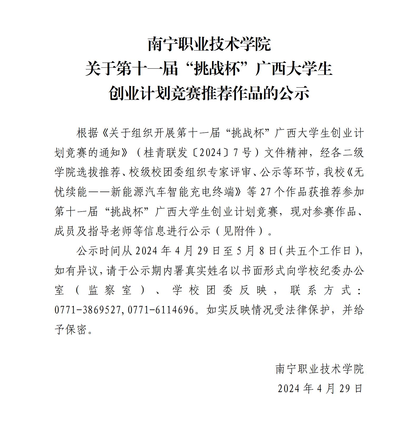 南宁职业技术学院关于第十一届“挑战杯”广西大学生创业计划竞赛推荐作品的公示