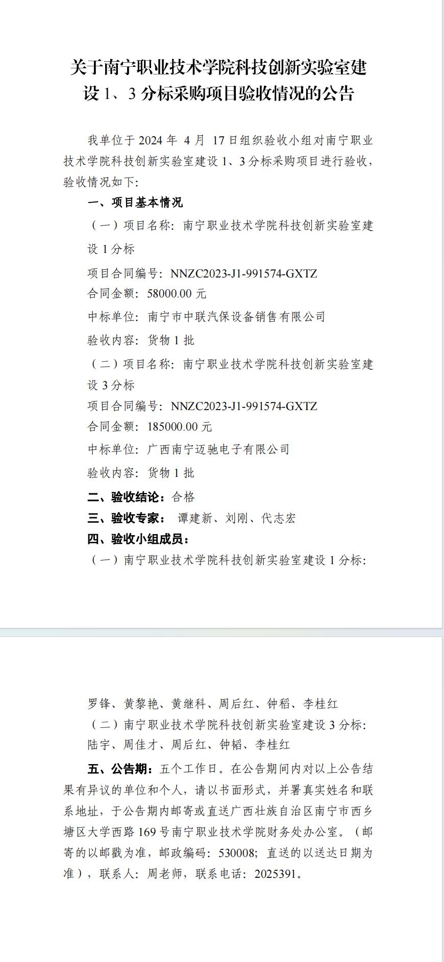 南宁职业技术学院科技创新实验室建设1、3分标采购项目验收情况公示