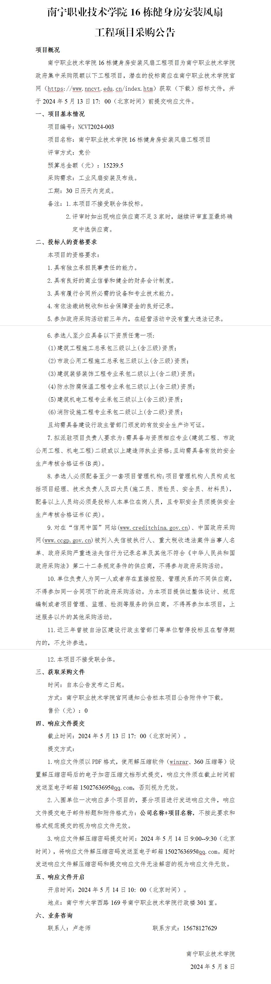 南宁职业技术学院16栋健身房安装风扇工程项目-采购公告