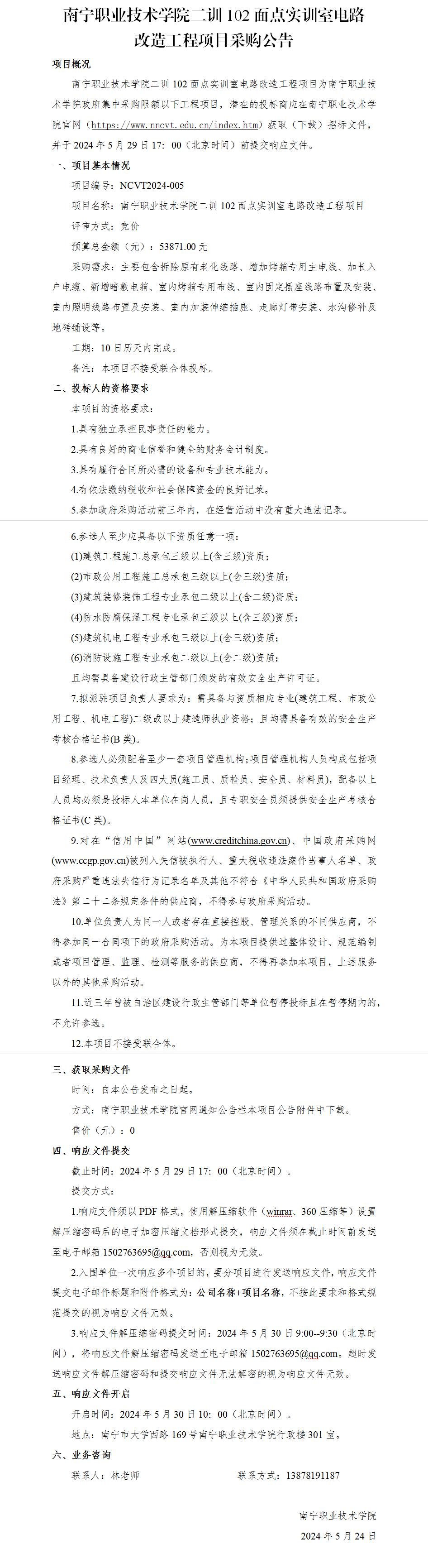 南宁职业技术学院二训102面点实训室电路改造工程项目-采购公告