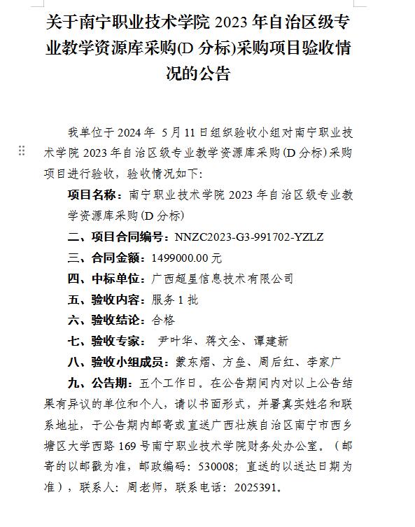 关于南宁职业技术学院2023年自治区级专业教学资源库采购(D分标)项目验收情况的公告