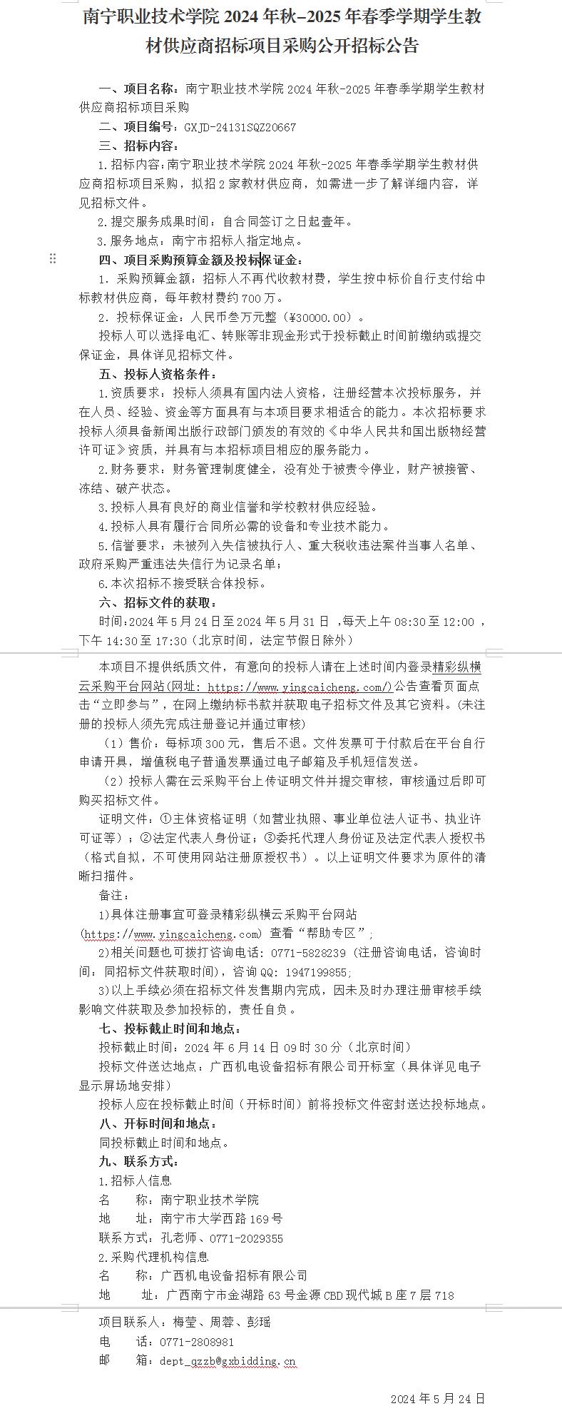 南宁职业技术学院2024年秋-2025年春季学期学生教材供应商招标项目采购公开招标公告