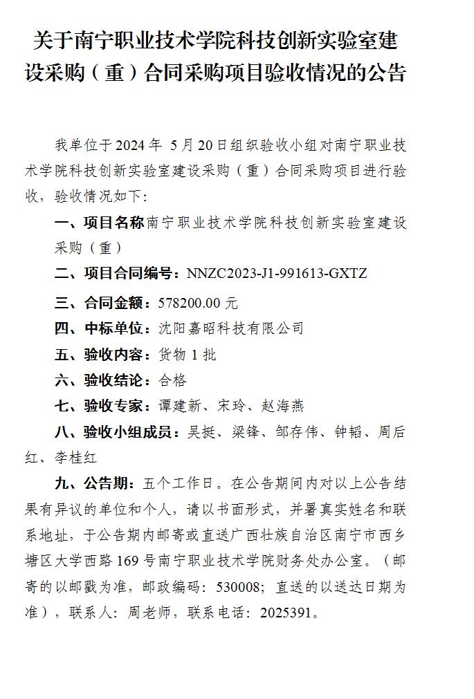 关于南宁职业技术学院科技创新实验室建设采购(重)合同采购项目验收情况的公告