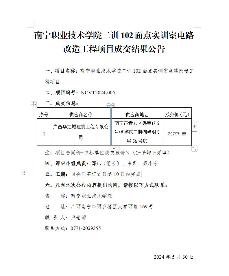 南宁职业技术学院二训102面点实训室电路改造工程项目-成交结果公告