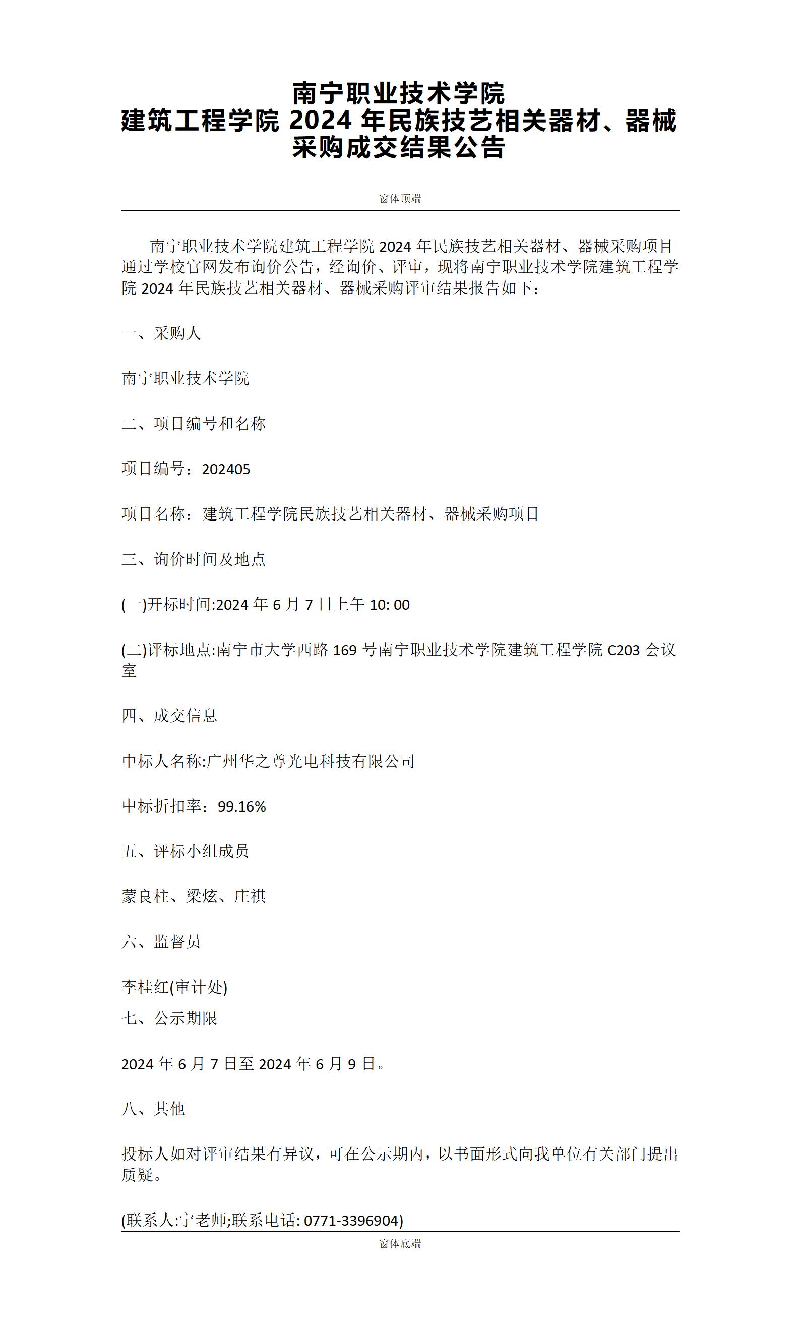 南宁职业技术学院建筑工程学院民族技艺相关器材、器械采购成交结果公告