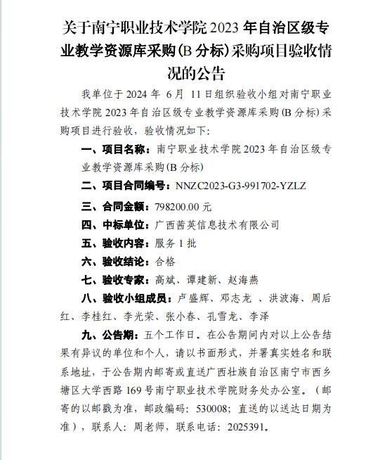 南宁职业技术学院2023年自治区级专业教学资源库采购(C分标)采购项目验收公告