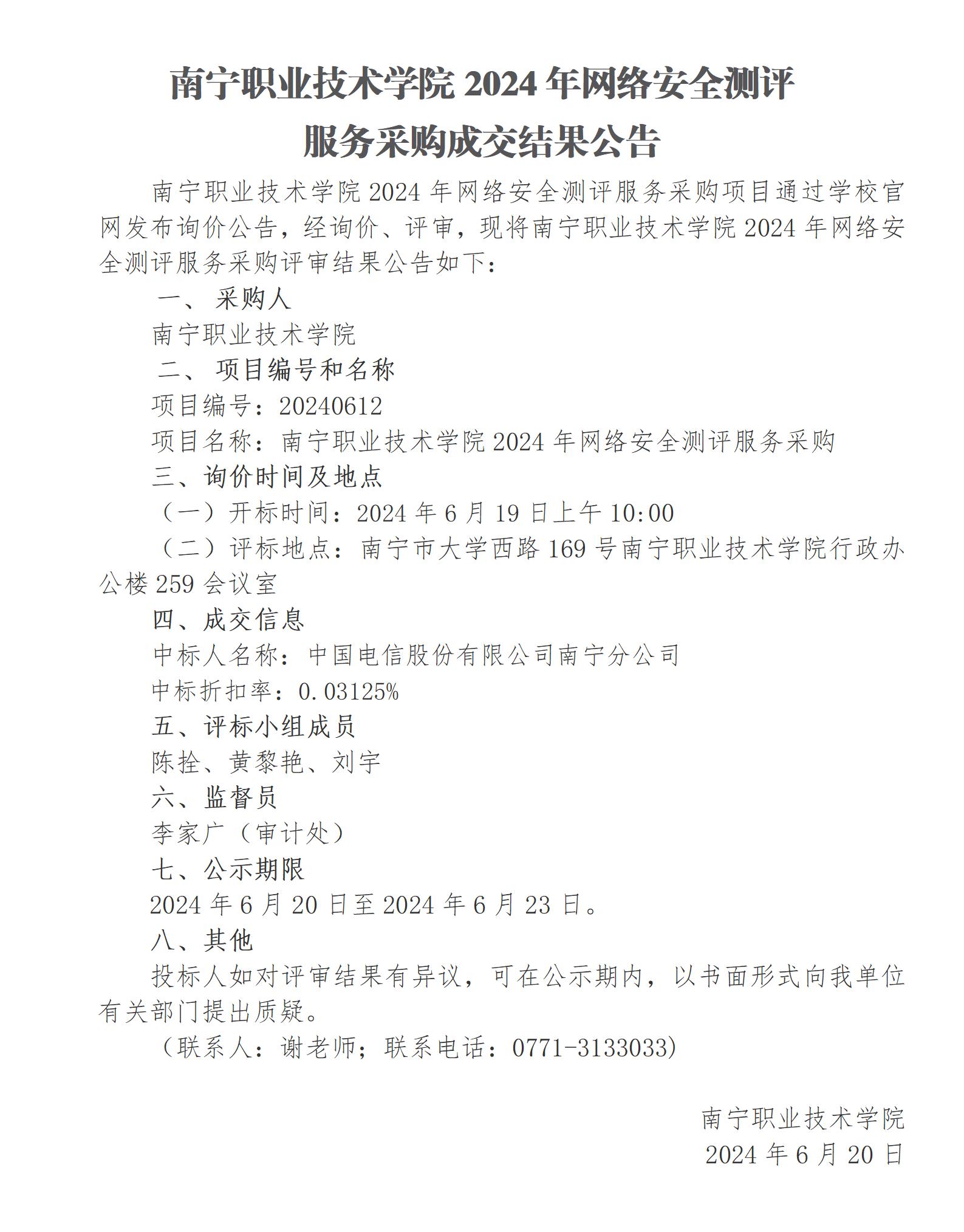 南宁职业技术学院2024年网络安全测评服务采购成交结果公告
