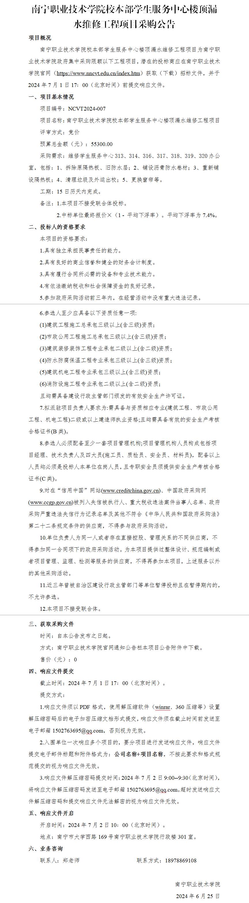 南宁职业技术学院校本部学生服务中心楼顶漏水维修工程项目-采购公告