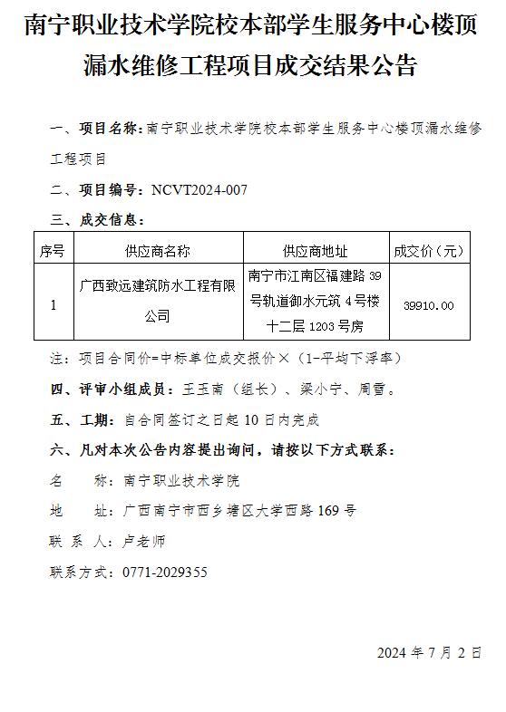 南宁职业技术学院校本部学生服务中心楼顶漏水维修工程项目-成交结果公告