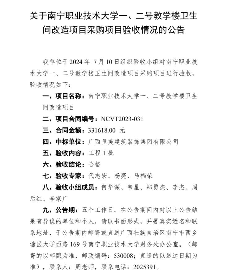 关于必赢优惠y272net 一、二 号教学楼卫生间改造项目采购项目验收情况的公告