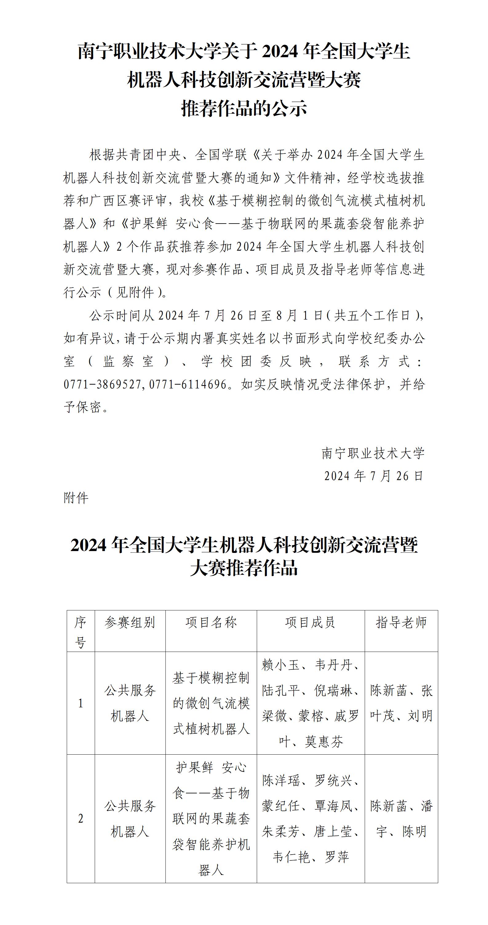 必赢优惠y272net关于2024年全国大学生机器人科技创新交流营暨大赛推荐作品的公示