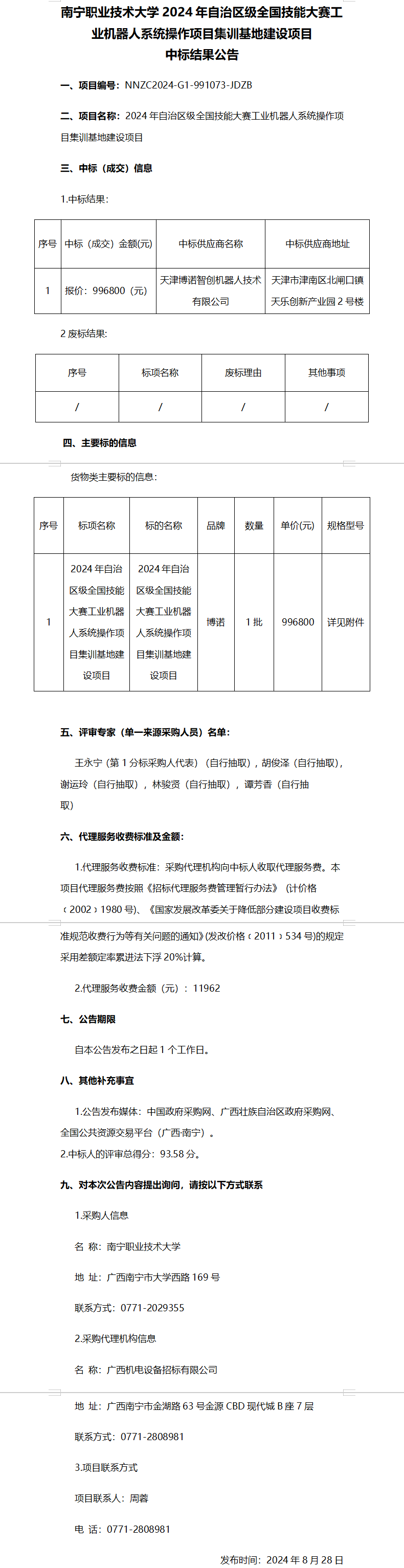 必赢优惠y272net2024年自治区级全国技能大赛工业机器人系统操作项目集训基地建设项目中标公告