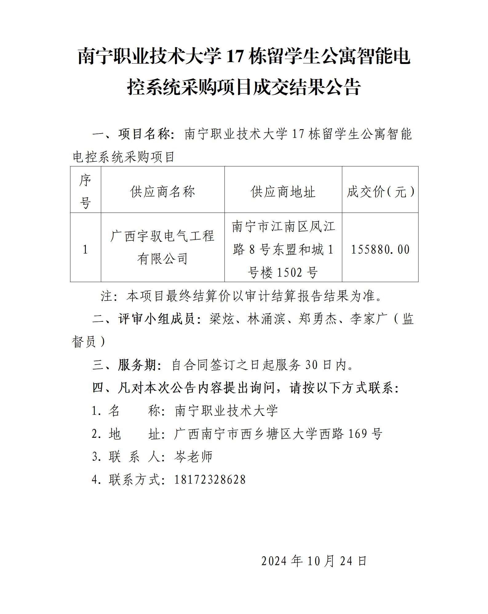 必赢优惠y272net17栋留学生公寓智能电控系统采购项目成交结果公告