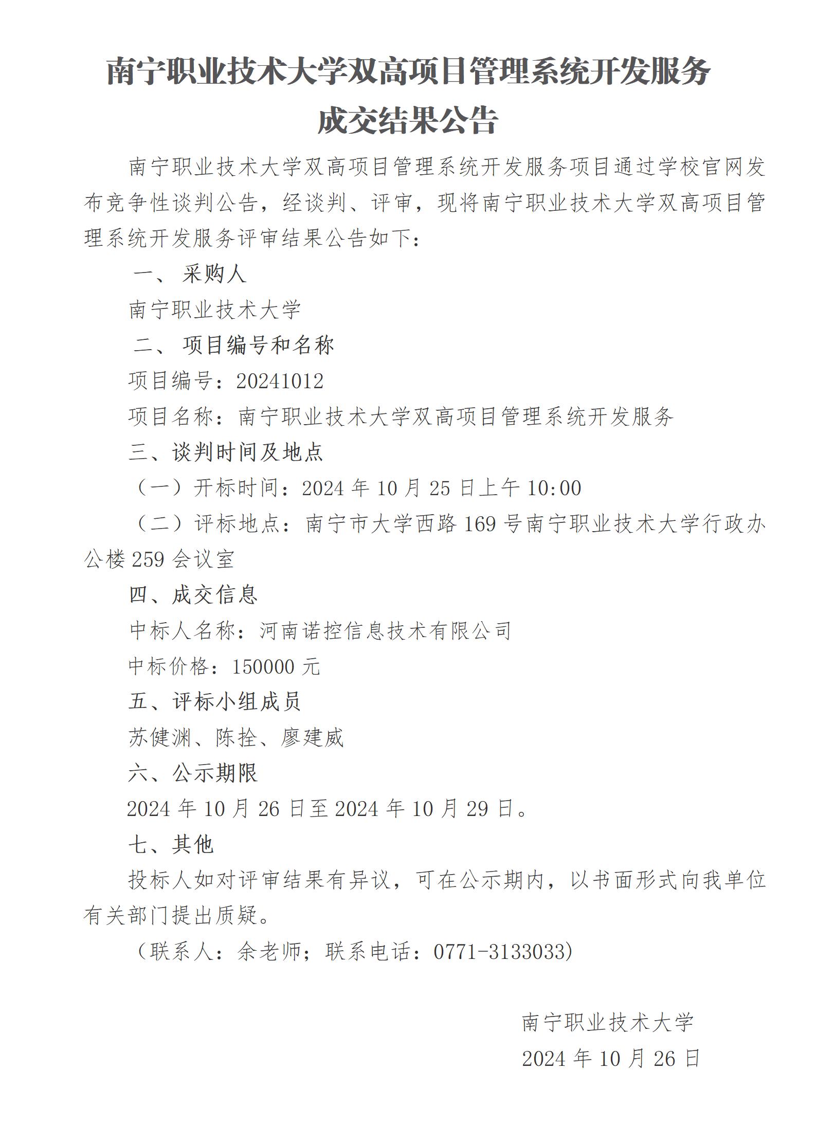 必赢优惠y272net双高项目管理系统开发服务成交结果公告