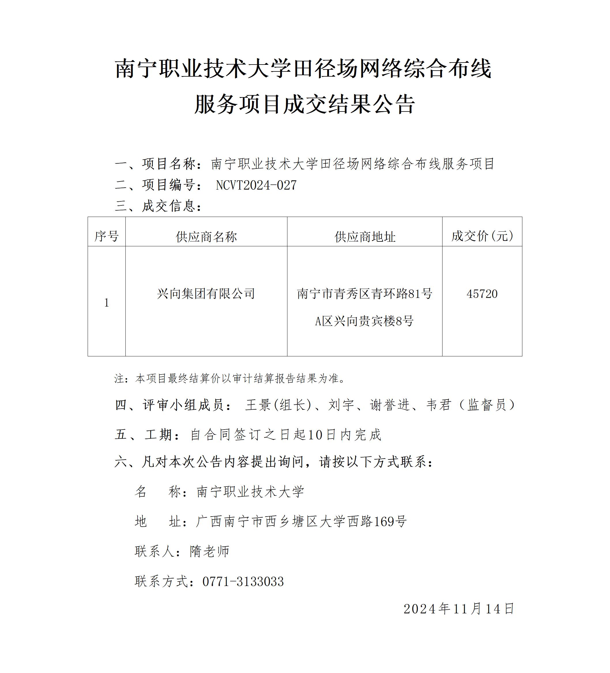 必赢优惠y272net田径场网络综合布线服务项目成交结果公告