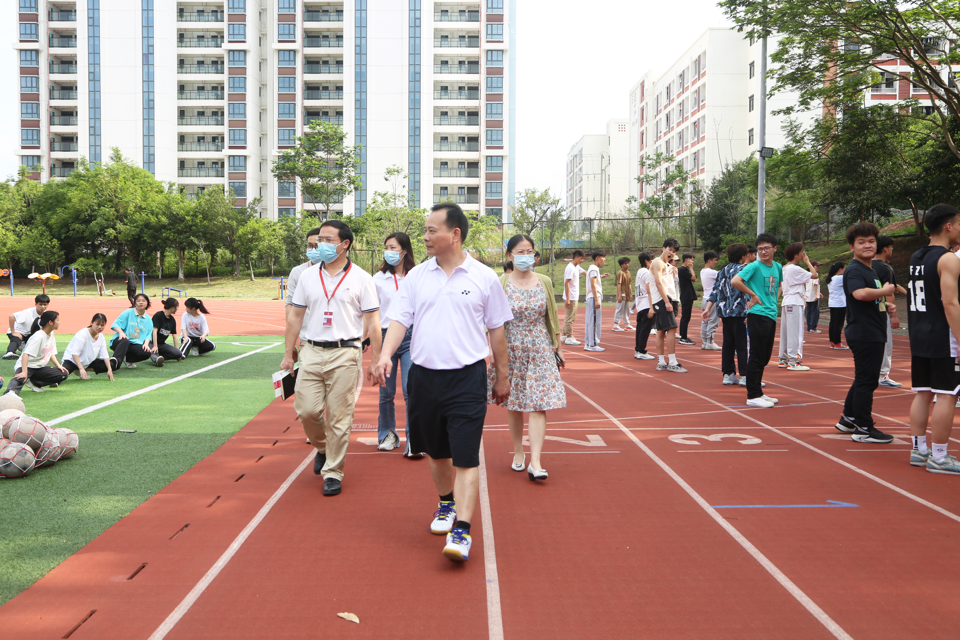 黄明瑞在田径场察看公共体育课上课情况(南职融媒雷小梅/摄)