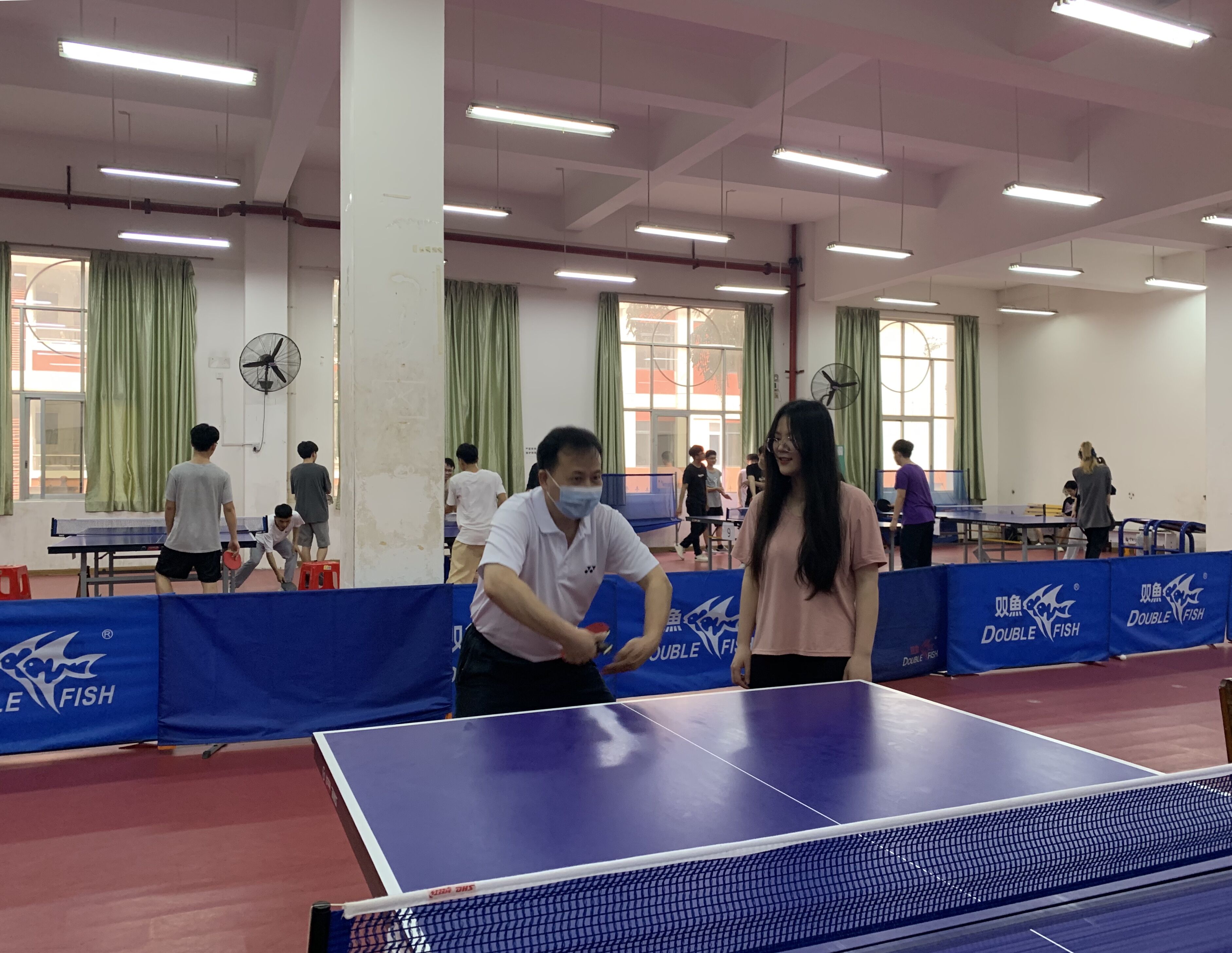 黄明瑞指导学生乒乓球接发技巧(陈秀泉/摄)