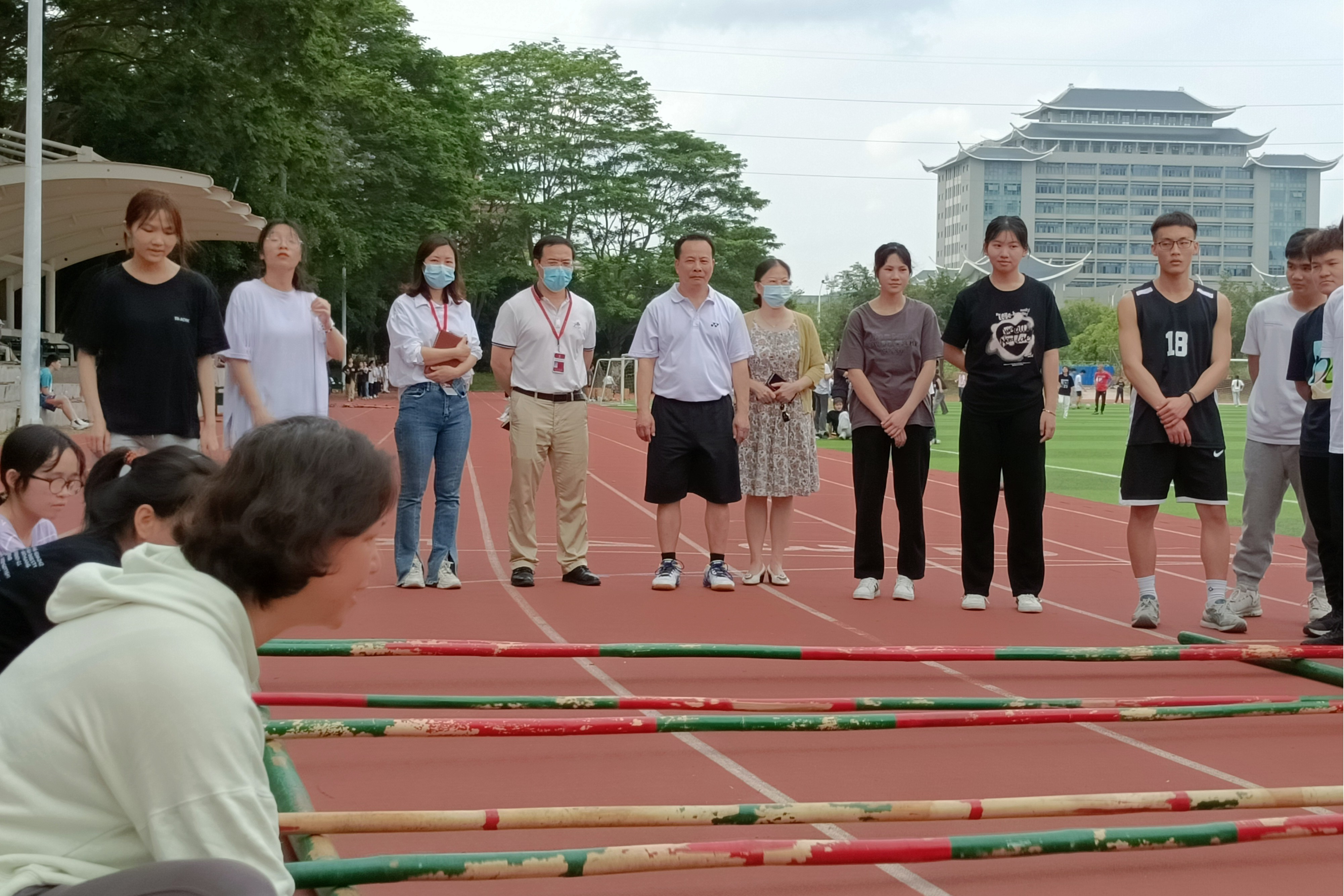 黄明瑞察看民族传统体育项目——跳竹竿课堂情况(南职融媒雷小梅/摄)