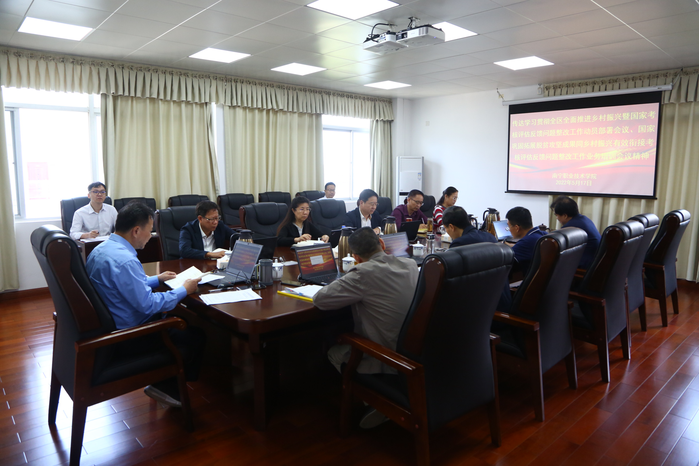 5月17日,学校党委书记黄明瑞主持召开学校党委会会议,深入传达学习贯彻全区全面推进乡村振兴暨国家考核评估反馈问题整改工作动员部署会议、国家巩固拓展脱贫攻坚成果同乡村振兴有效衔接考核评估反馈问题整改工作业务培训会议精神。学校领导,学校党委委员参加会议,后勤管理处负责人列席会议。