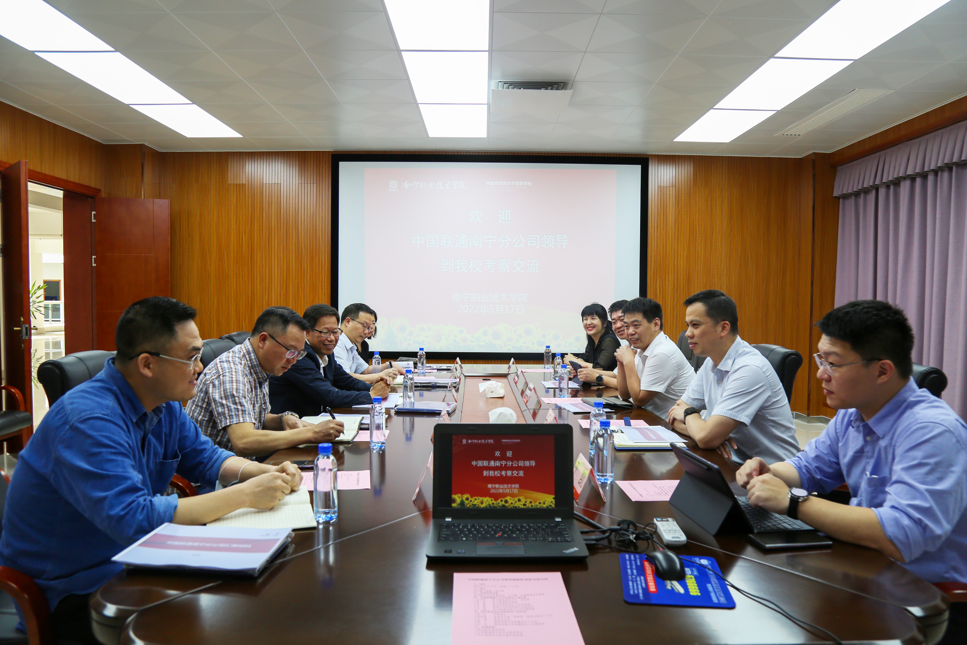 龙立军对南职院所取得的发展成就表示高度赞赏,并从公司发展战略、业务拓展、人才架构等方面进行综合分析,表达了公司对于高质量数字通信人才的迫切需求,希望与南职院一道开展深入合作,充分发挥双方优势资源,在专业建设、人才培养、技术研发、实习就业等方面实现强强联合。中国联通公司南宁分公司其他到访人员,结合各自分管领域,表达了在建设数字化校园、打造校园实训基地等方面的合作设想。