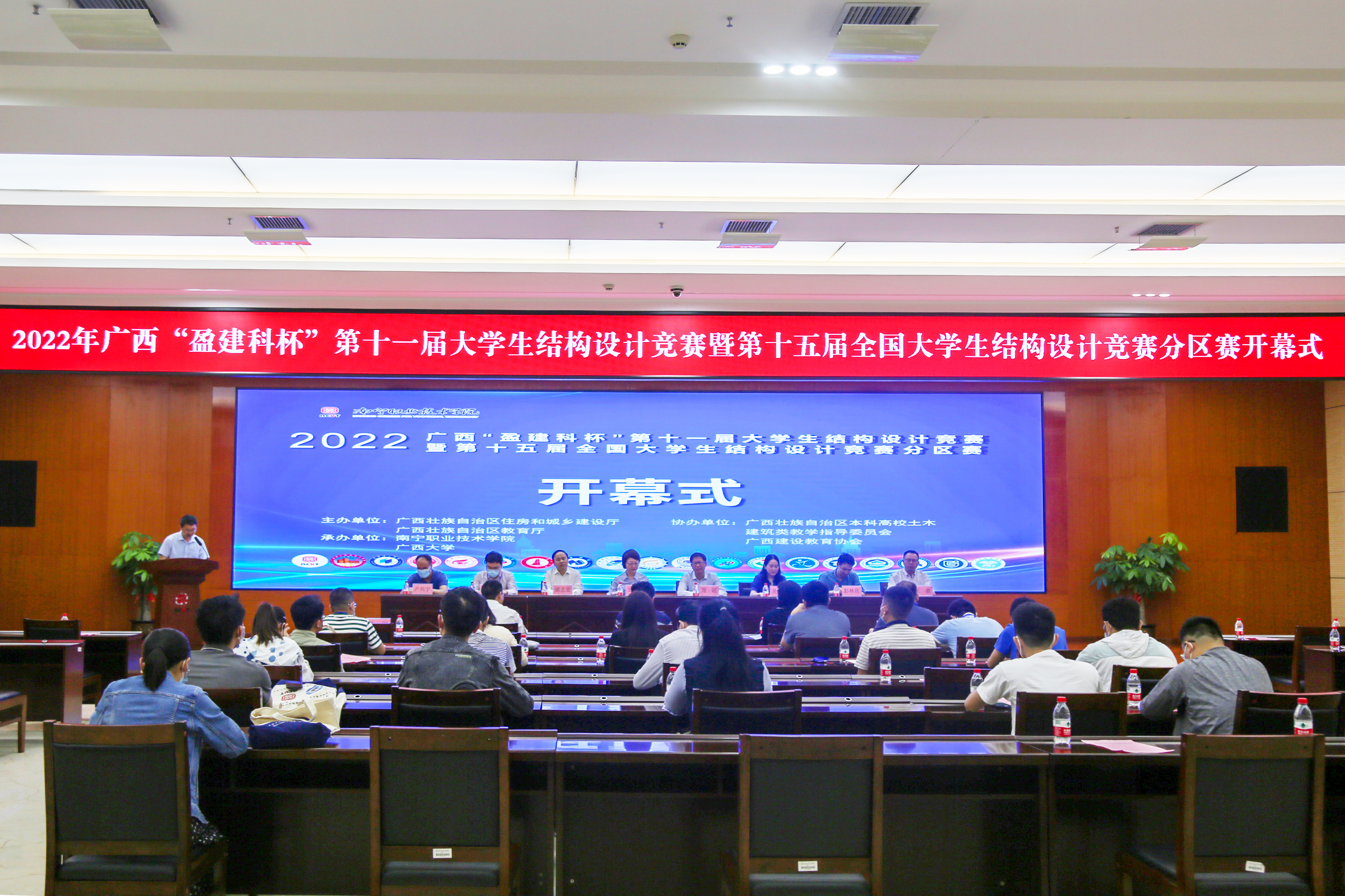 5月19日上午,由广西壮族自治区住房和城乡建设厅、广西壮族自治区教育厅主办,广西壮族自治区本科高校土木建筑类教学指导委员会、广西建设教育协会协办,必赢官网和广西大学联合承办的2022年广西“盈建科杯”第十一届大学生结构设计竞赛暨第十五届全国大学生结构设计竞赛分区赛,在必赢官网二号会议厅举行开幕式。学校校长周旺,广西壮族自治区住房和城乡建设厅、广西壮族自治区本科高校土木建筑类教学指导委员会、广西建设教育协会有关领导出席开幕式。开幕式由建筑工程学院党委书记、院长陈纲主持。