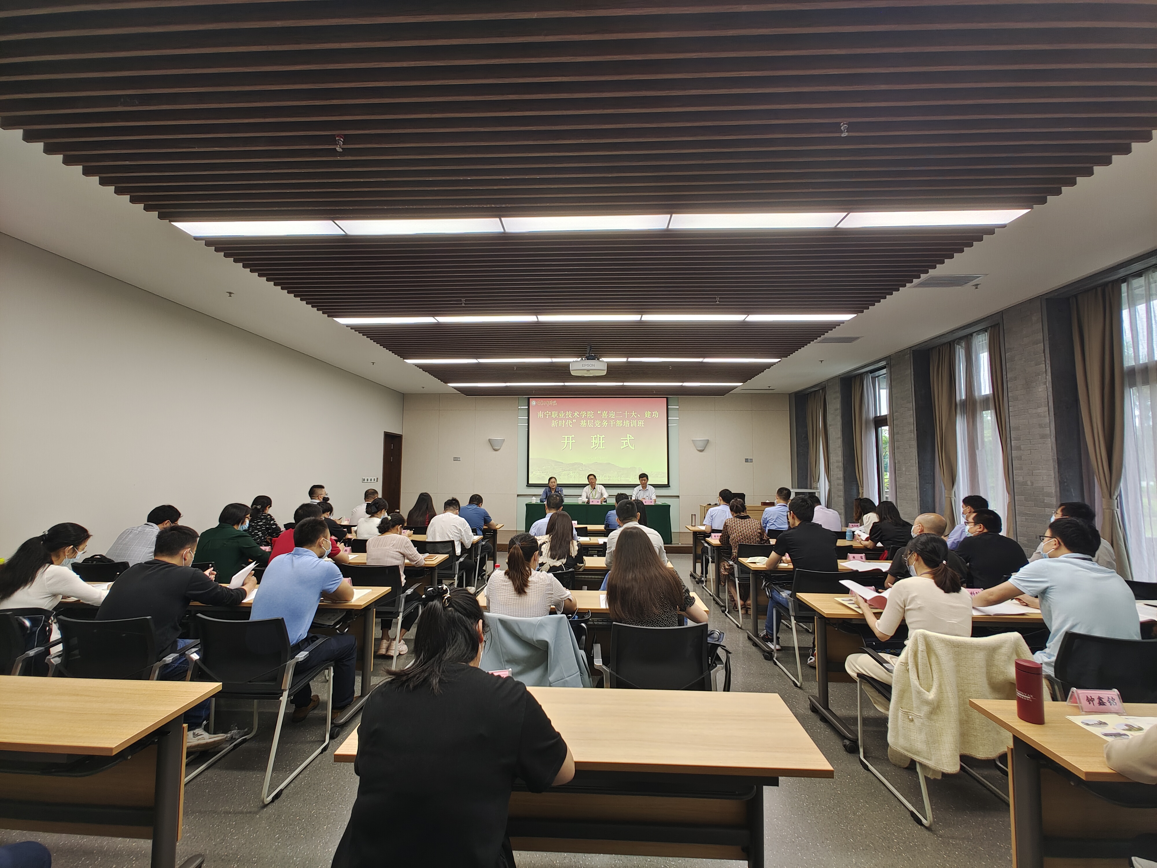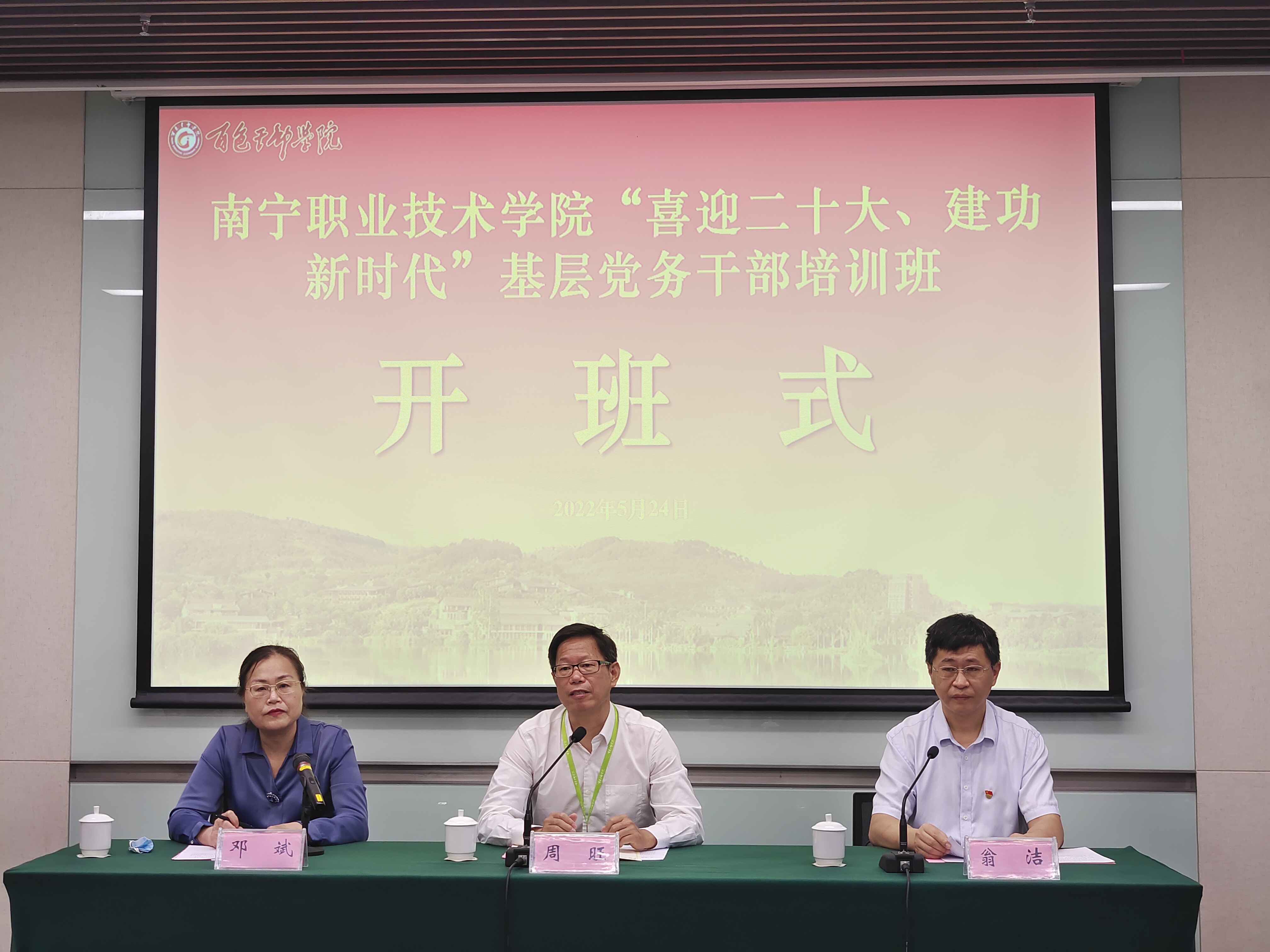5月24日上午,南宁职业技术学院“喜迎二十大、建功新时代”基层党务干部培训在百色干部学院顺利开班。学校校长周旺出席开班式并讲话。各二级党委副书记、组织员,二级学院所辖党支部书记、支部委员,各直属党支部书记、支部委员、党务干部等共43人参加培训。开班式由党委组织部(统战部、人事处)部长(处长)邓斌主持。