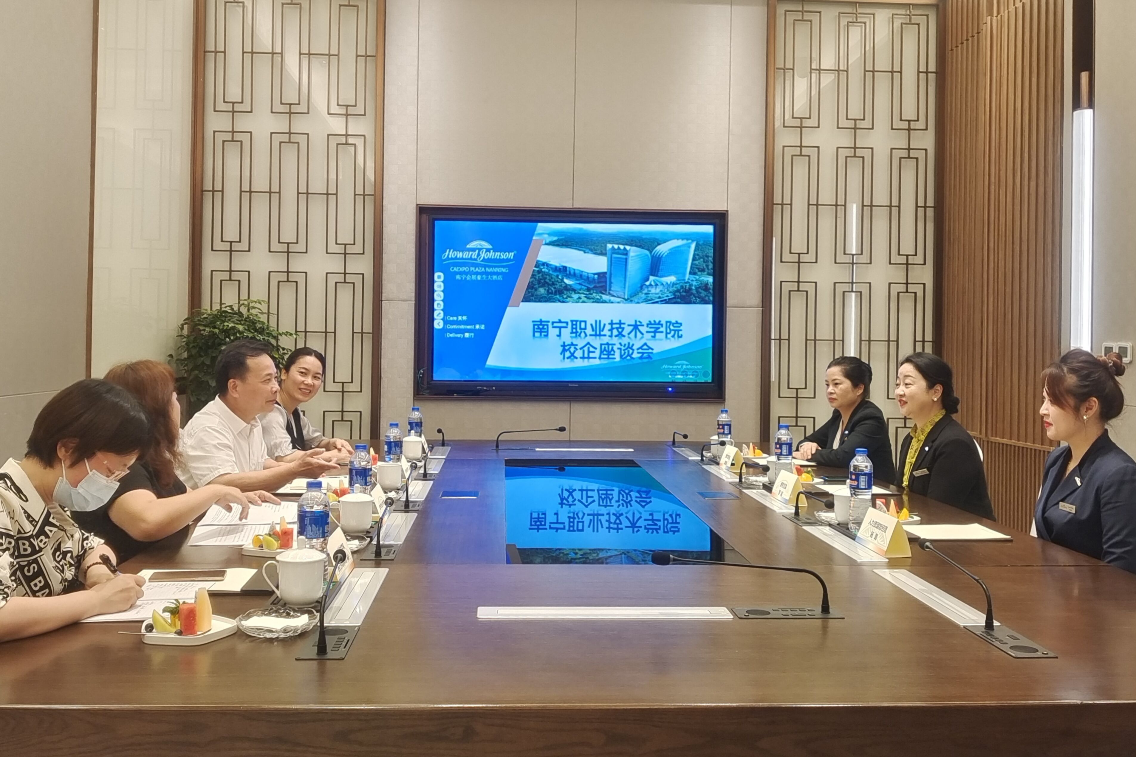 在广西国宾美景养生酒店,黄明瑞向企业负责人介绍了南职院的办学宗旨与特色。南职院是全国餐饮职业教育示范院校、文化和旅游部旅游职业教育校企合作示范基地以及自治区旅游人才培训示范基地。其中,酒店管理与数字化运营专业为国家示范重点建设专业,烹饪工艺与营养和旅游管理专业为广西壮族自治区优质专业。经过多年的发展,南职院在旅游行业各要素的人才培养上形成了专业集群,为旅游业输送了大量的高素质技术技能型人才。
