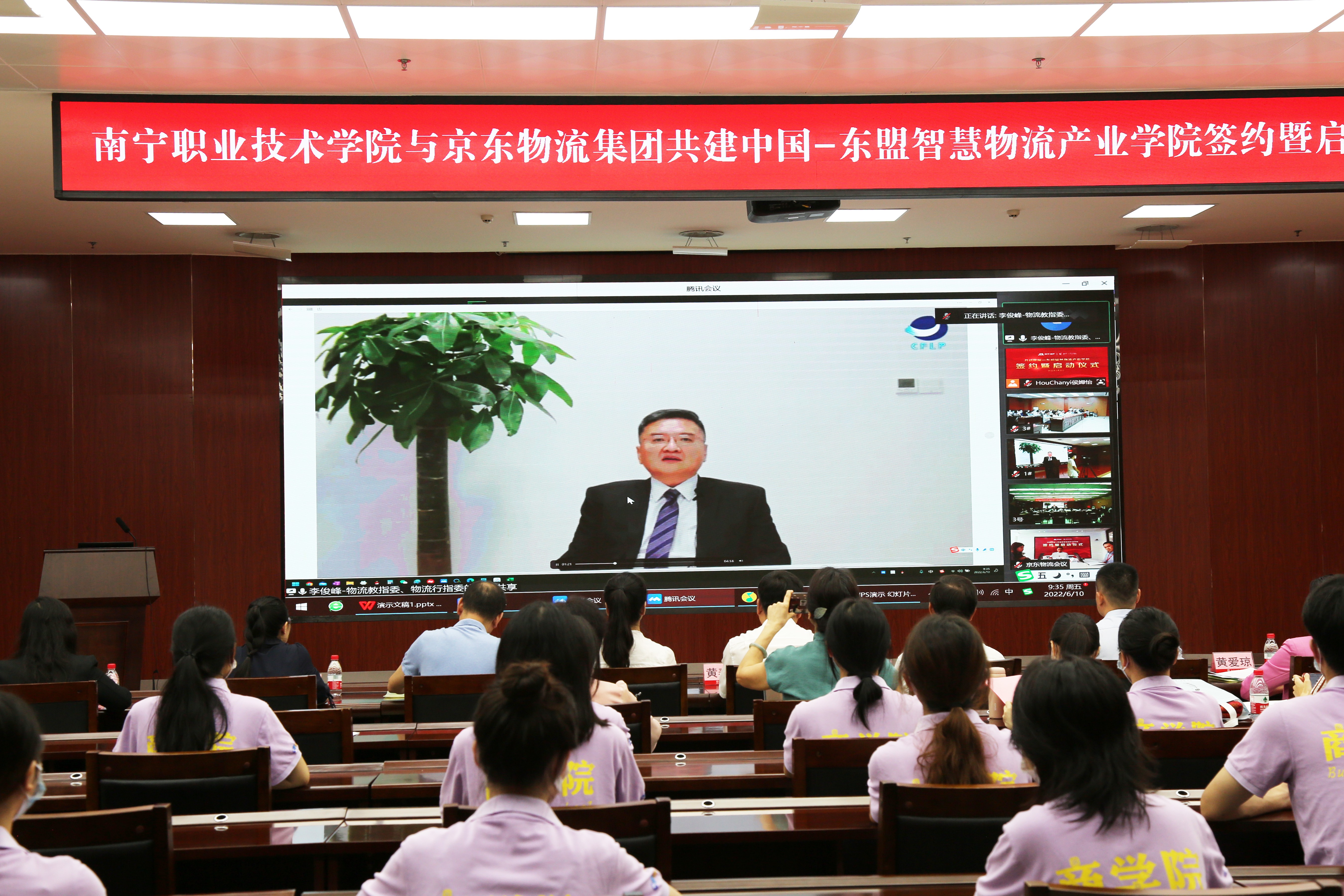 6月10日,必赢官网与京东物流集团共建中国-东盟智慧物流产业学院签约暨启动仪式,在南宁职业技术学院会议中心三号厅和京东物流集团北京总部隆重举行。本次会议采用线上线下方式同步进行,中国物流与采购联合会副秘书长兼全国物流职业教育教学指导委员会秘书长郭肇明,副秘书长兼培训部部长李俊峰,京东物流教育总经理范广辉,学校校长周旺、副校长黄春波,广西物流与采购联合会副会长兼秘书长黄爱琼,广西交通厅运输厅综合运输管理处四级调研员李铭辉,以及国内外企业、行业、高校的30多名代表出席本次仪式。