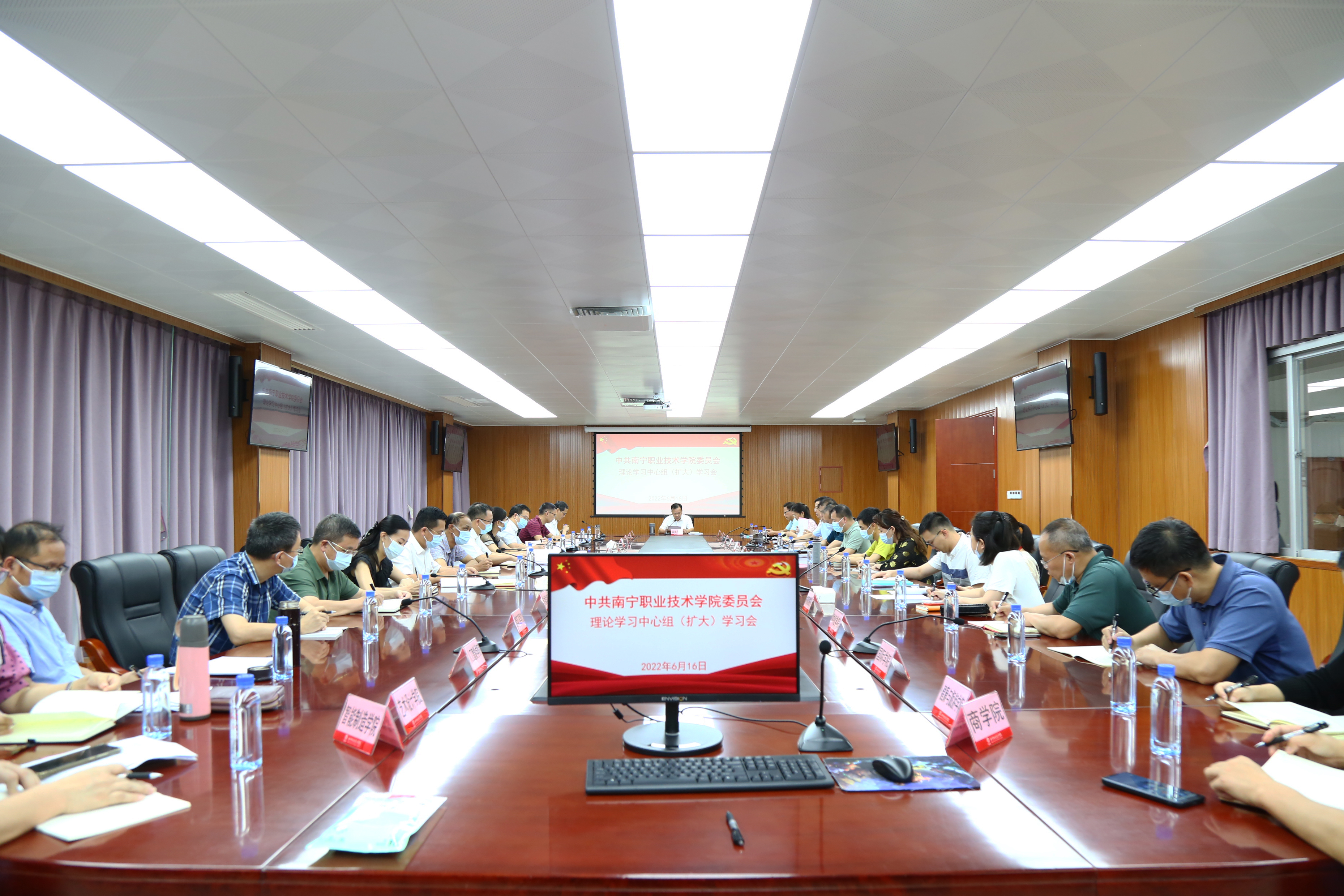 6月16日,必赢官网召开党委理论学习中心组(扩大)学习会,重温习近平总书记视察广西“4・27”重要讲话精神和对广西工作系列重要指示要求;深入学习宣传贯彻习近平总书记在中国人民大学考察时重要讲话精神、习近平总书记给中国冰雪健儿重要回信精神、习近平总书记关于安全生产重要论述;深入学习贯彻《百年初心成大道——党史学习教育案例选编》《百年大党面对面》《中国共产党普通高等学校基层组织工作条例》《中华人民共和国职业教育法》《信访工作条例》《中华人民共和国国家安全法》等文件精神,研究部署学校贯彻的具体意见措施。学校党委书记黄明瑞主持会议并作讲话。自治区文化和旅游厅信息科技教育处处长蒙毓刚列席旁听学习会。学校领导、学校党委委员,各二级学院、各直属部门党政主要负责人参加学习会。