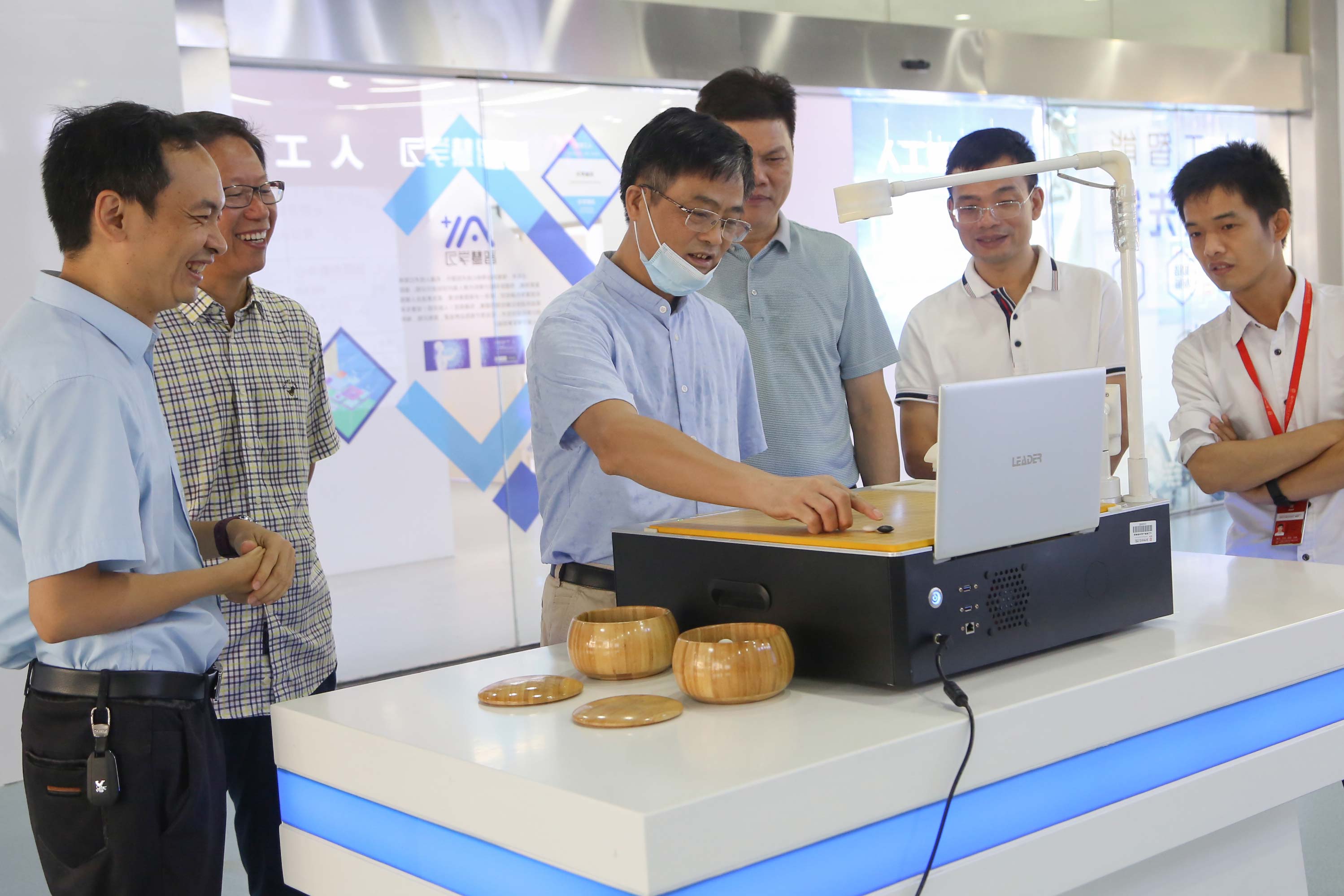 唐咸兴(前排左二)与智能机器人对弈(南职融媒赵宗鼎/摄)