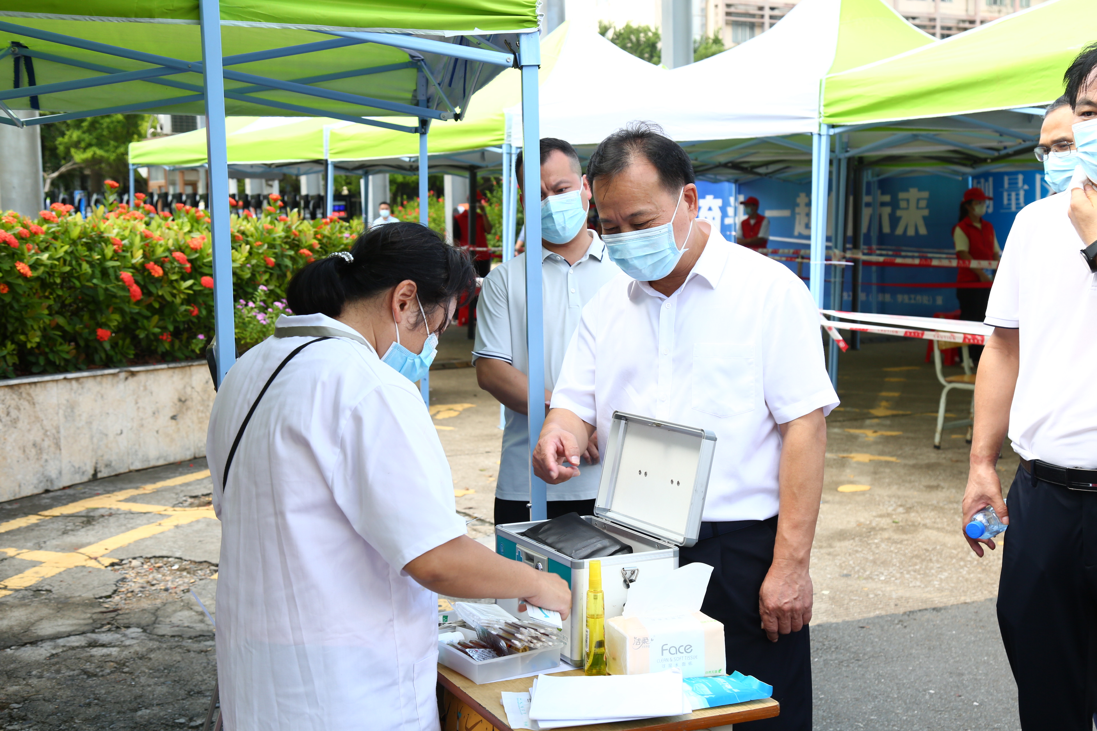 黄明瑞一行检查学校二号门医疗服务点医疗物资准备情况(陈诚/摄)